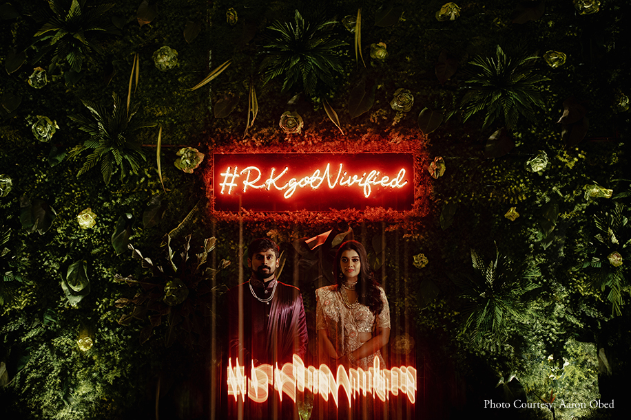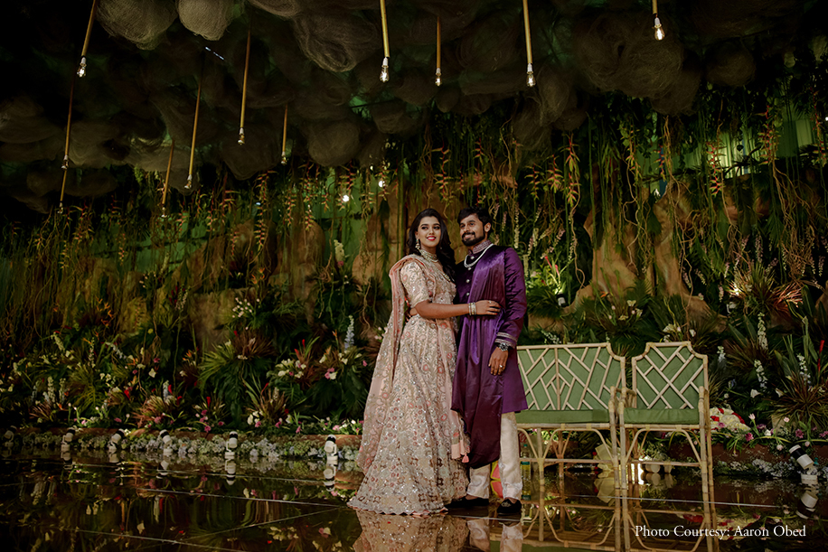 Hosted in the charming city of Coimbatore, in Tamil Nadu, Nivetha and Raghul’s opulent wedding reception was like a breath of fresh air all thanks to its unique ‘tropical forest’ theme.