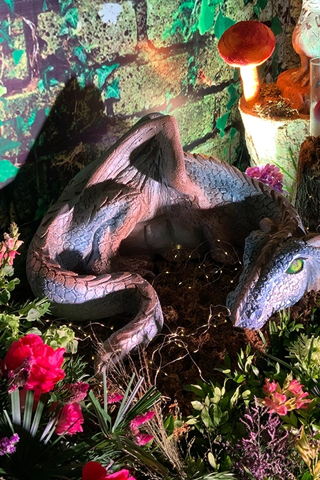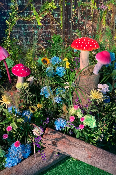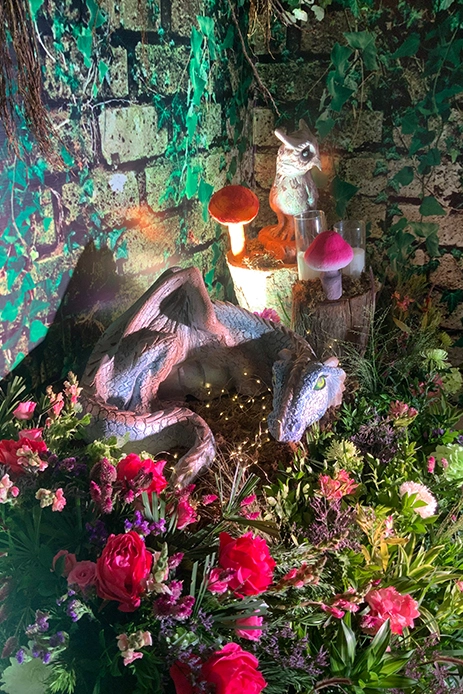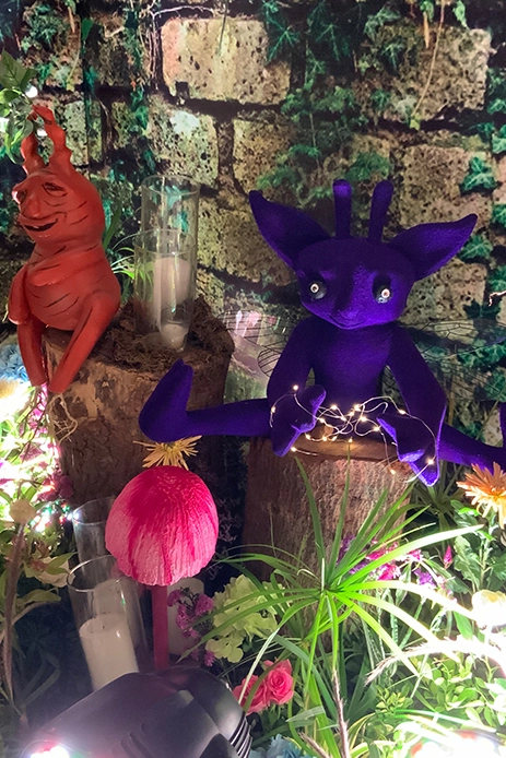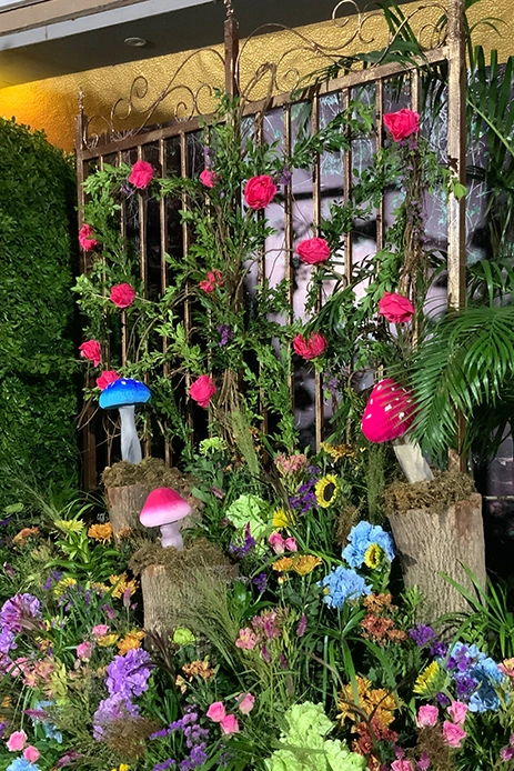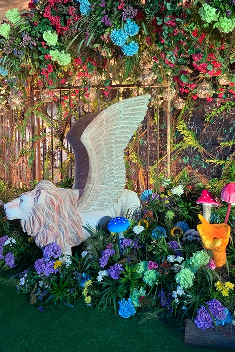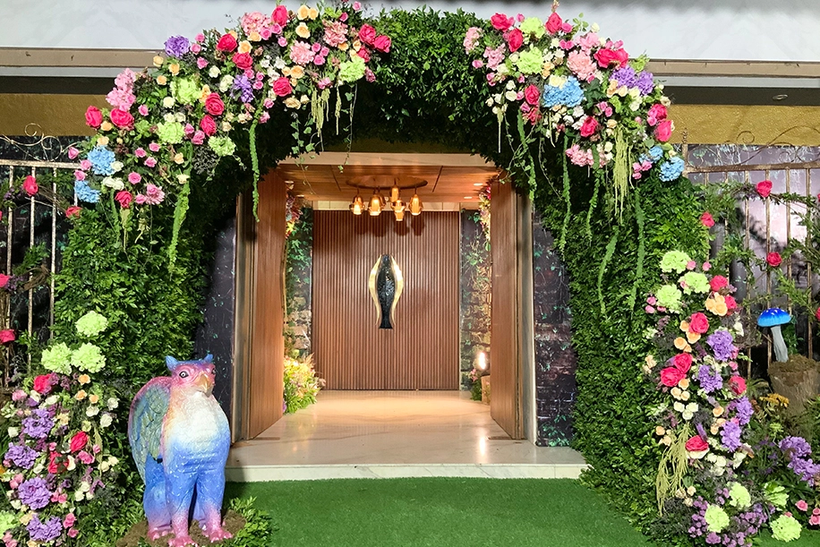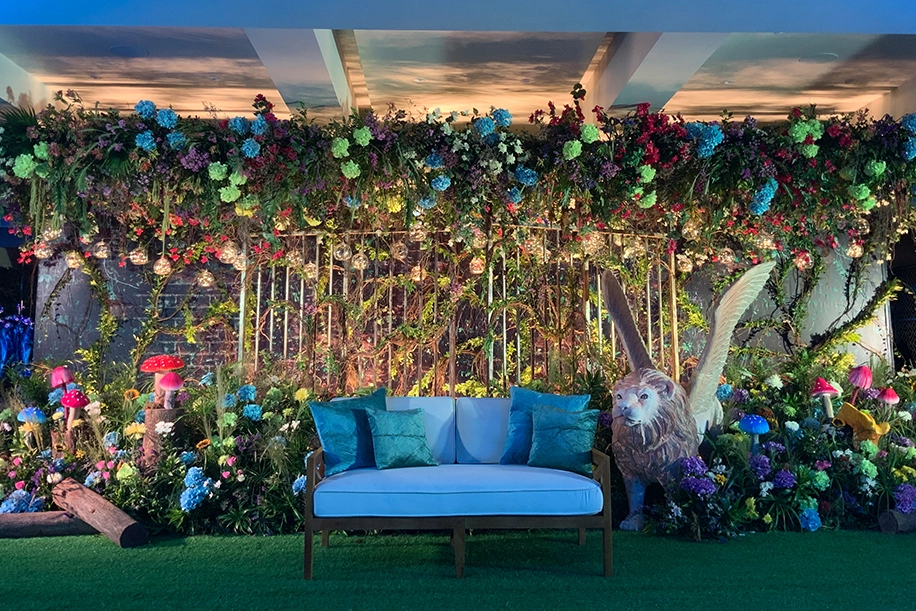 The attendees walked through a floral arch at the entrance where two mythical creatures stood guard to give them a flavor of what awaited them inside. On entering, the guests were treated to a mesmerizing play of lights where they were invited to get comfy on off-white velvet sofas and armchairs, drinks in hand even as they were transported to an enchanted forest. Using a curious mix of rustic, forest-like decor props like wooden logs, twigs and synthetic grass mats, the decor team created a wild atmosphere that transported the guests into the wilderness. Contrasting them were out-of-this-world elements: a plethora of vivid blooms, bright-hued mushrooms, statues of imaginary woodland creatures, LED screens displaying a fairytale-like forest backdrop, chrome pillars and subdued neon lights that swathed the entire venue in a soothing glow.