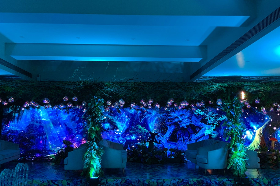 Orchestrating a decor as dreamy as this is no mean feat. However, the decor team relished this experience as it gave them the perfect opportunity to think out-of-the-box! Aman shares, “Once the enchanted forest theme was selected, we started brainstorming on the kind of decor elements we would be using. In folklore and fantasy, an enchanted forest is a forest full of intrigue and enchantments. Hence we referred to old tales as well as modern works of fantasy to pick out mythical characters from different corners of the globe, Furthermore, mood lighting, lush foliage and bright colors were used to reassert the theme!”