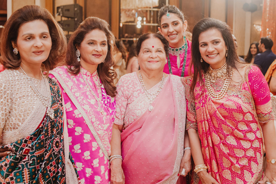 Left: Nita Ambani, Chhaya Momaya, Shloka Ambani, Nirmal Momaya, Anand Piramal; Right: Chhaya & Nirmal Momaya