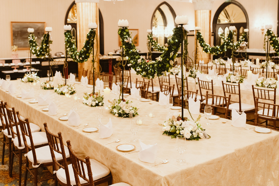 For the post-wedding reception at The Taj Mahal Palace, Mumbai, we wanted a very global spread with vegetarian cuisines including Mexican, Mediterranean, and Italian. The desserts were displayed on antique sideboards as it was all about presentation and sophisticated serving. The seating was inspired by Jamanvars and Western countries with guests sitting in rows facing each other to allow for conversations over a meal.