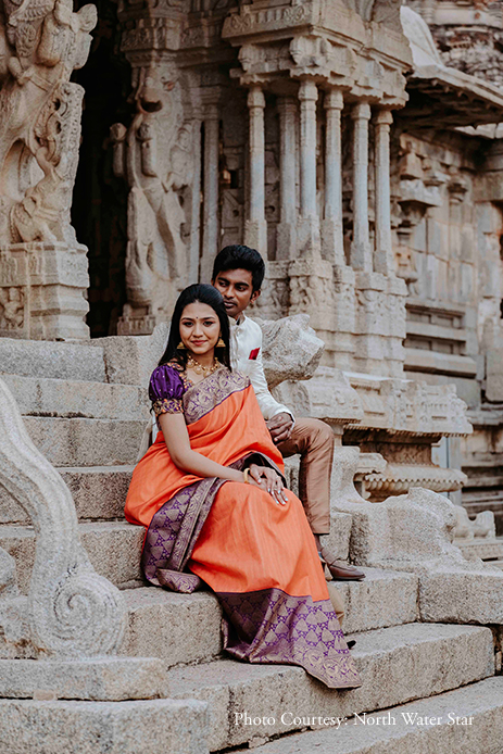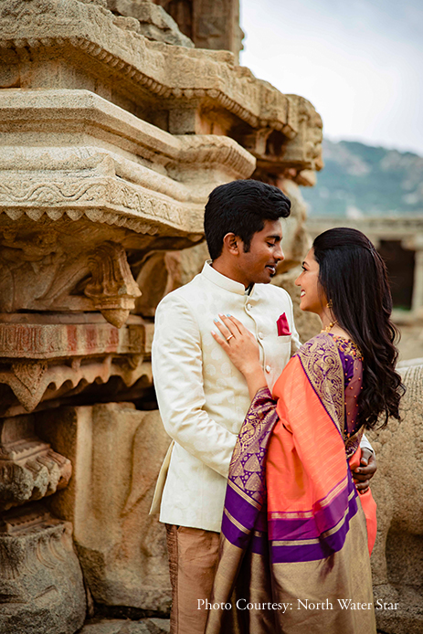 Rohini and Dheeraj, who met through an arranged marriage setup, recently got hitched at Dheeraj’s hotel, The Groves in Bangalore. Their pre-wedding shoot took place amidst the old stone ruins of the UNESCO World Heritage site of Hampi and at the stunning Evolve Back, Hampi resort that was built to mirror the majesty of the Vijayanagara kingdom. They chose WeddingSutra Favorite – North Water Star for the shoot whose team conceptualized the perfect frames to match the architectural splendor of the locations.