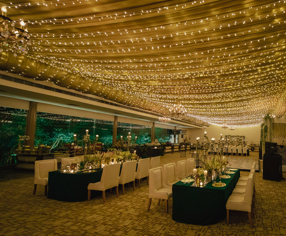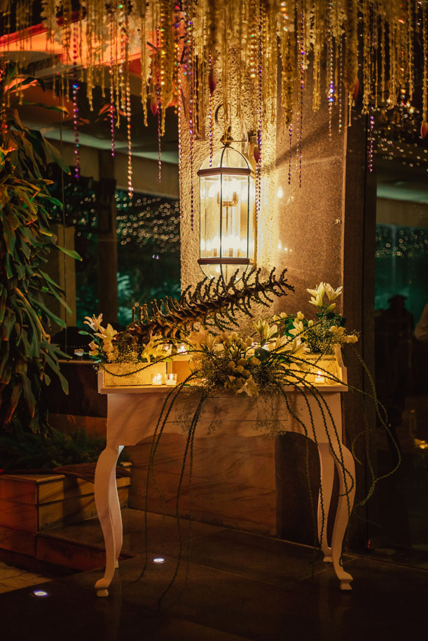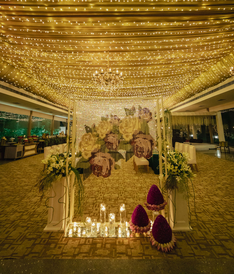 At the entrance, we had two consoles styled with fishtail palm barks and accessories. Within the ballroom, guests saw a gorgeous rose patterned Swarovski curtain which we used as a visual block to the space. Twinkling lights glittered amidst the champagne drapes on the ceiling. We had a classic bar in a black wood that went with the high-backed chairs and tufted furniture.