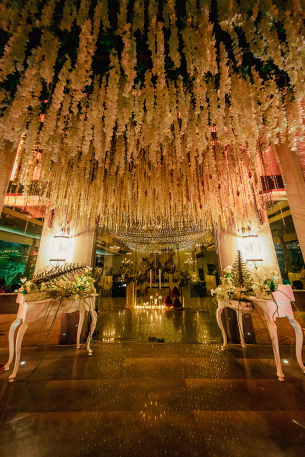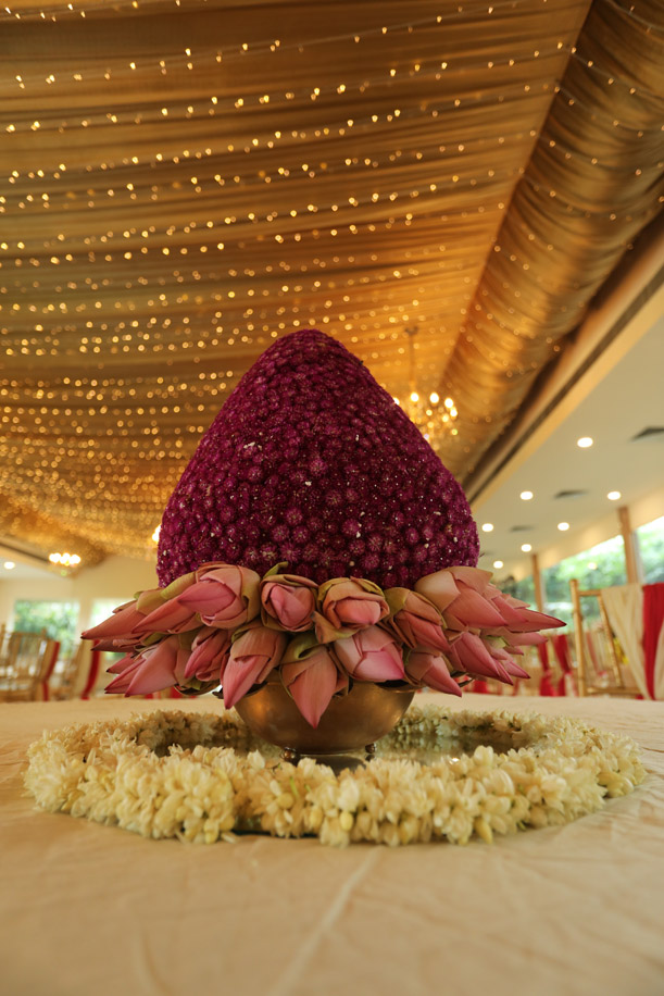 Guests were greeted at the entrance by the sight of a colossal lotus installation made of brass with cascading flowers and Swarovski crystals. Vases brimming with Indian blooms on the tables accentuated the greenery at the venue. The mandap featured Indian elements like kaleereins, mogras, rosebuds and lotuses. It was the highlight of the wedding.