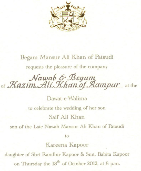 Kareena and Saif’s invitation card is all over the world wide web thanks to an invitee Nawab Kazim Ali Khan of Rampur who uploaded the much sought-after invitation on his Facebook fanpage. The invitation is simple & elegant. Not an elaborate creation from Delhi’s famed invitation card designers like Ravish Kapoor or EDC, one of whom usually design cards for the rich and famous. Kareena and Saif’s invitation is very typical in royal style. We asked Royal Historian & Blogger Akshay Chavan what he thinks of the same. “The royal invitations were never known to be flashy or flamboyant. White or cream colored cards with the family crest embossed in gold was the royal signature style. It was all about understated elegance. An interesting feature of this invitation is the use of their title. Pataudis have generally downplayed their royal origins. But mother Sharmilla has mentioned her name in the invitation as ‘Begum Mansur Ali Khan Pataudi’ underlining her status as the ‘Begum of Pataudi’.