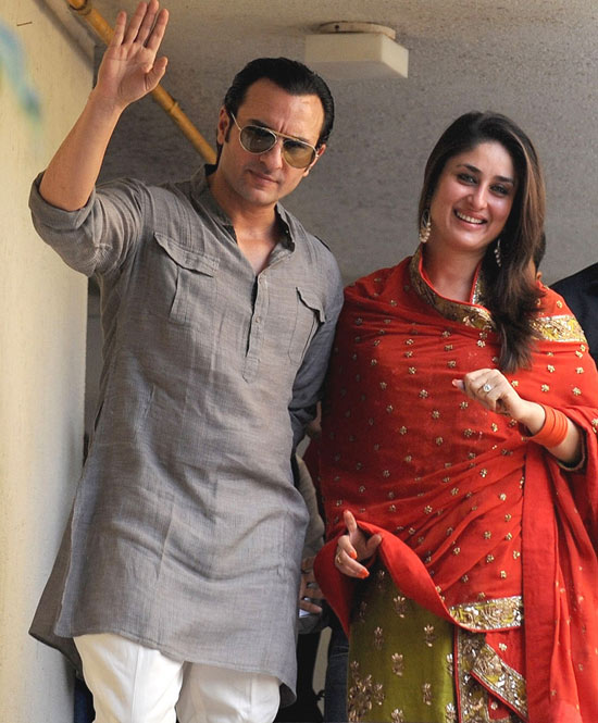 Kareena Kapoor and Saif Ali Khan wave to the media after their registered wedding at home