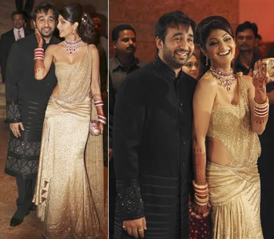 Shilpa’s sexy two piece outfit in gold with Swarovski-encrusted bodysuit along with a satin sari-style gown, would have been perfect for a Red Carpet. For a wedding reception, the world expected more from Shilpa Shetty. Maybe Shilpa was going for an edgy look for the grand finale@ Grand Hyatt– after wearing stuff heavy and bright for the wedding and pre-wedding functions. But its her day and we gotta say that she did look good!