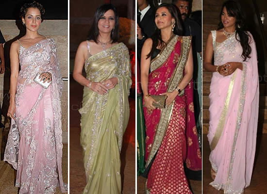 Rani Mukerjee’s pretty pink Manish Malhotra saree with a classy beige-brown border.