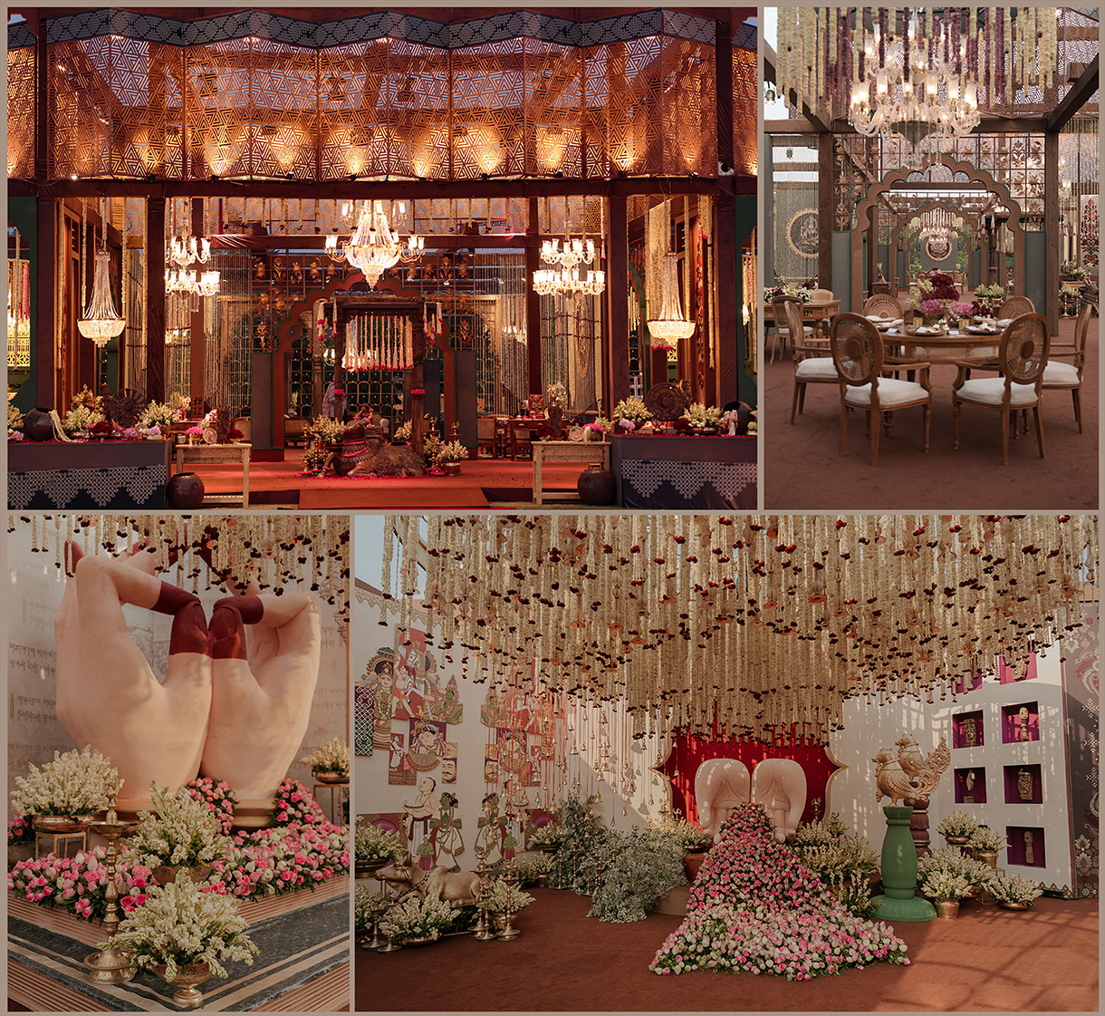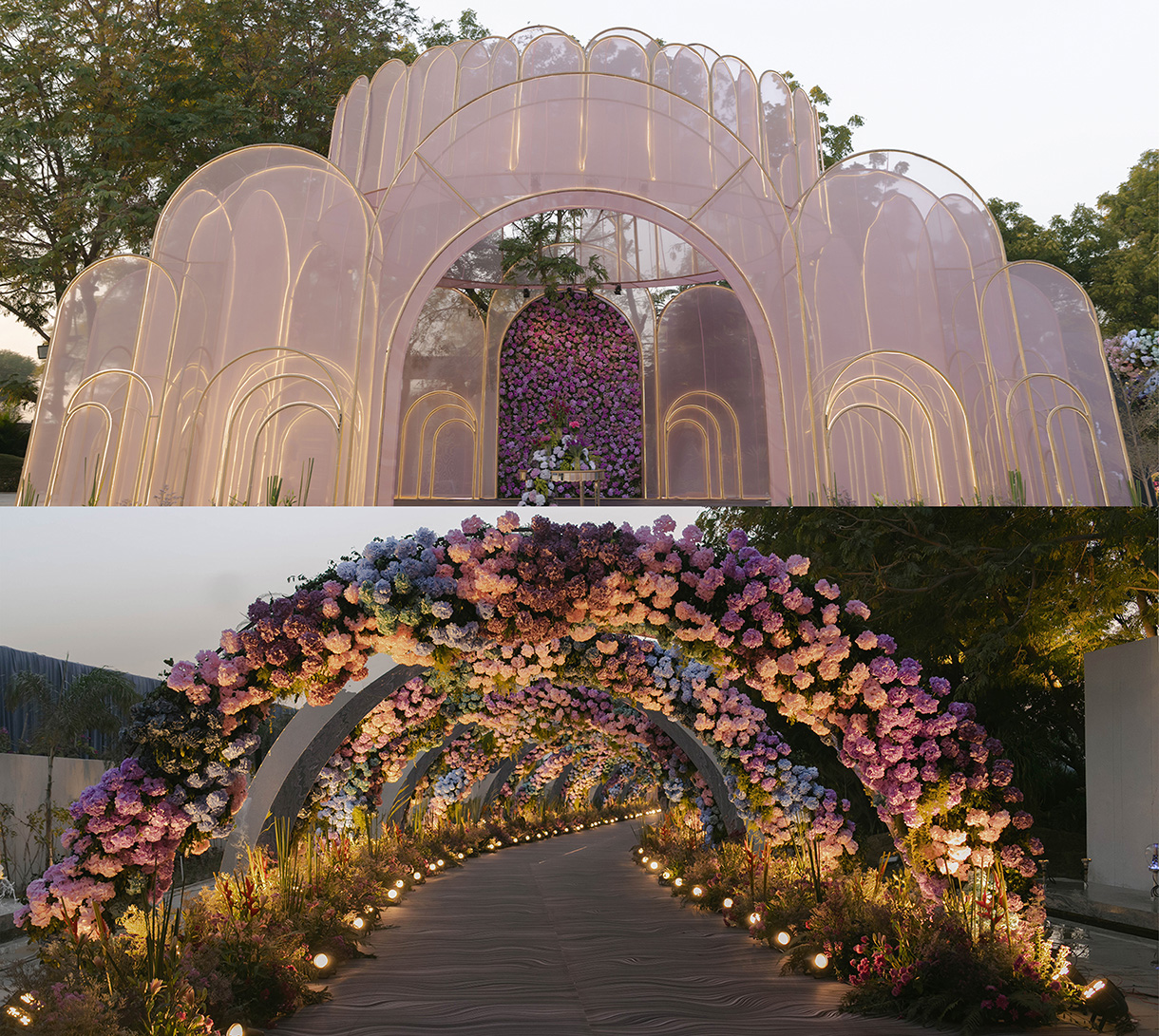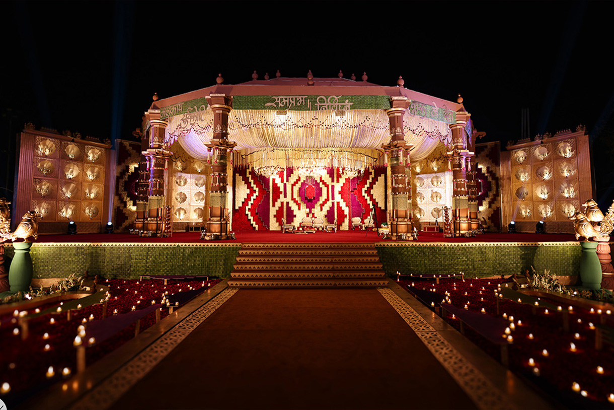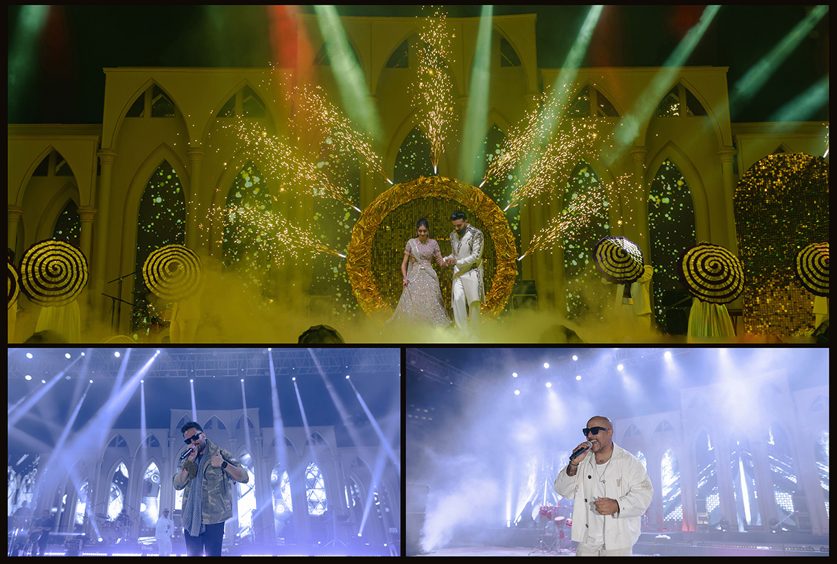 “The ‘Abstract’ themed Sangeet was an artistic spectacle—bold in concept, breathtaking in execution. Spanning 1.25 lakh sq. ft., the immersive setup hosted 1,800 guests, with elegant sit-down lounges for 600. Guests entered through a massive floral dome, a Gucci-inspired butterfly gate, and red-beaded chandeliers, journeying through surreal passageways. The night pulsed with energy, with 25 spirited family performances, A live set by Bollywood composers Vishal-Shekhar and DJ Ganesh, who kept the dance floor alive till dawn. At the heart of it all stood a stage framed by a Roman-inspired abstract façade—dramatic, dynamic, and unforgettable.”