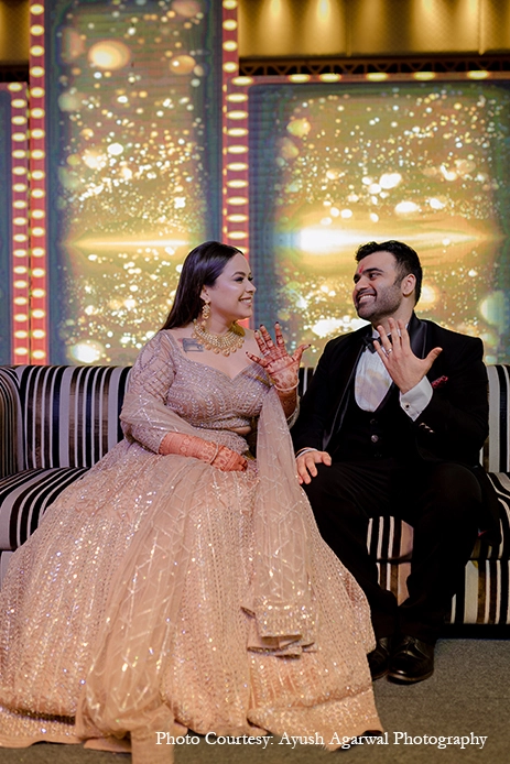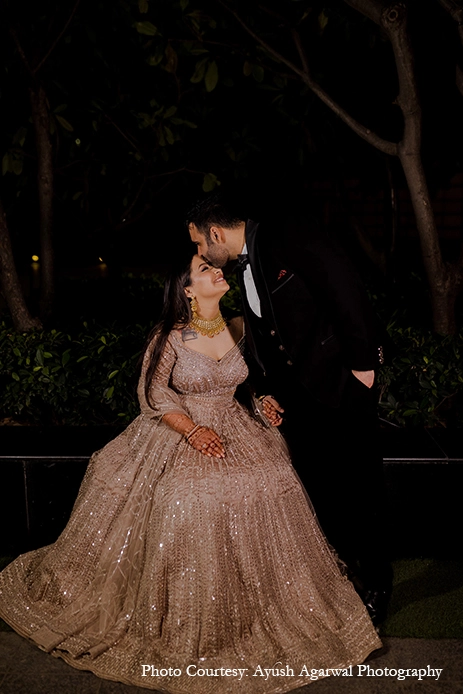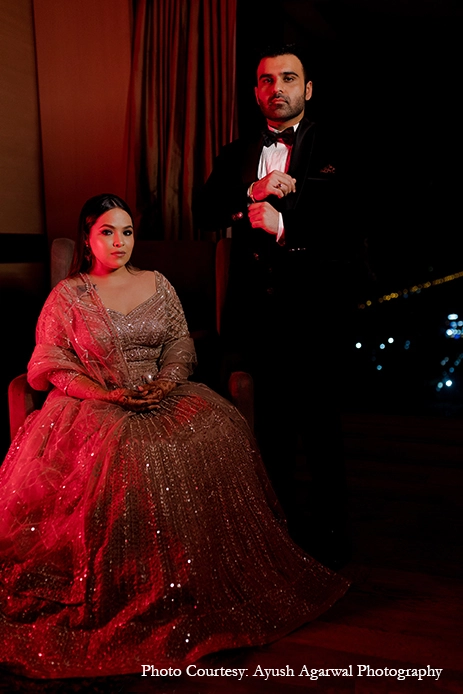 The glitzy Cocktail soiree kicked off the Delhi wedding on a high with hearty entertainment and glamorous decor. The couple and their loved ones had everyone in high spirits with their stunningly choreographed dance performances. Ashina shares, “I wanted our performance to be nothing short of spectacular, for which Aman and I practiced over video call for ten days!” The bride dazzled in a champagne lehenga while the groom looked dapper in a classic tuxedo.