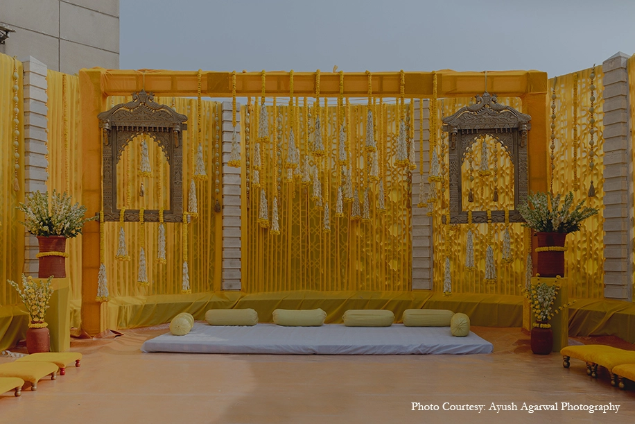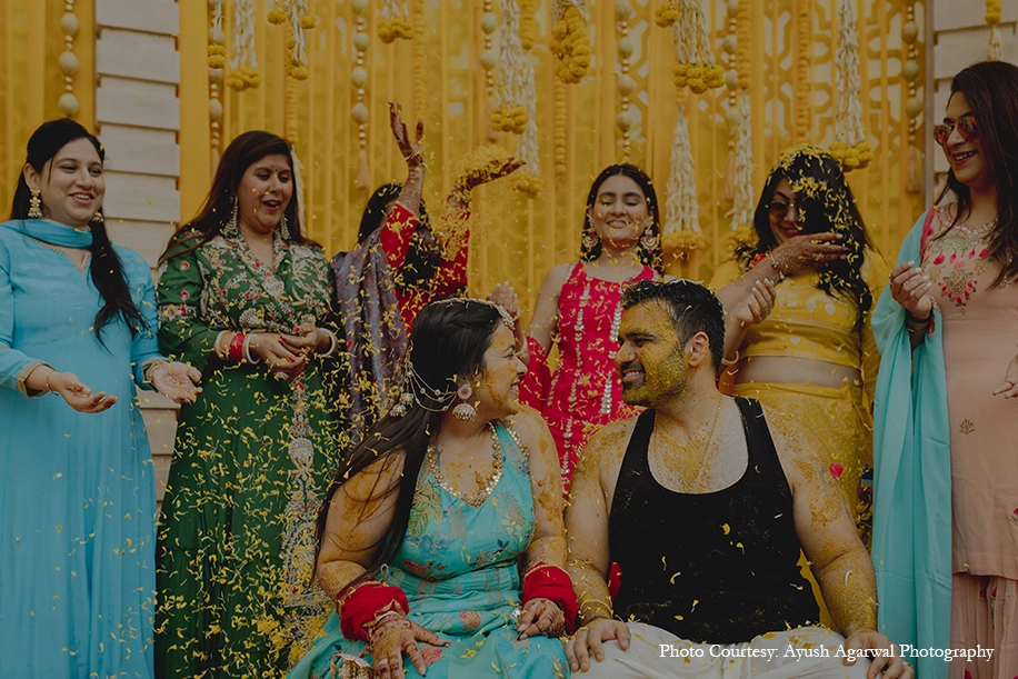 The Haldi function saw lively sun-kissed decor of yellow marigolds at the venue. The wall of flowers for the couple-corner was artfully accentuated with traditional jharokha structures for a royal feel. The bride donned a bright turquoise ensemble to contrast the sea of yellow to add a fun twist.