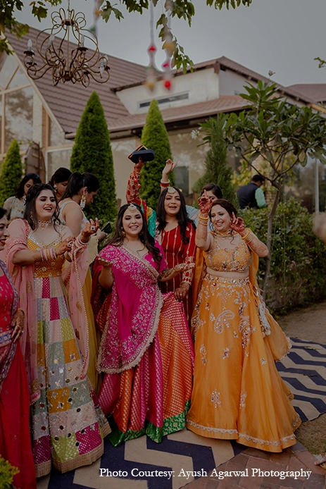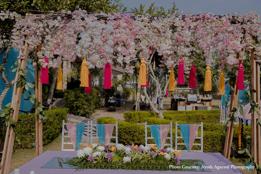 Hosted at Trellis Garden in Chandigarh, the Mehndi sundowner was a vibrant function full of colors and enjoyment. A bright blend of bougainvillea and marigolds lit up the lush venue, along with drapes, tassels and other quirky props. A delightful warmth of shimmering fairy lights enveloped the festivities as the evening progressed. The bride opted for a patchwork silk lehenga in hues of fuchsia and orange as she got her hands covered with intricate henna designs along with her friends and family.