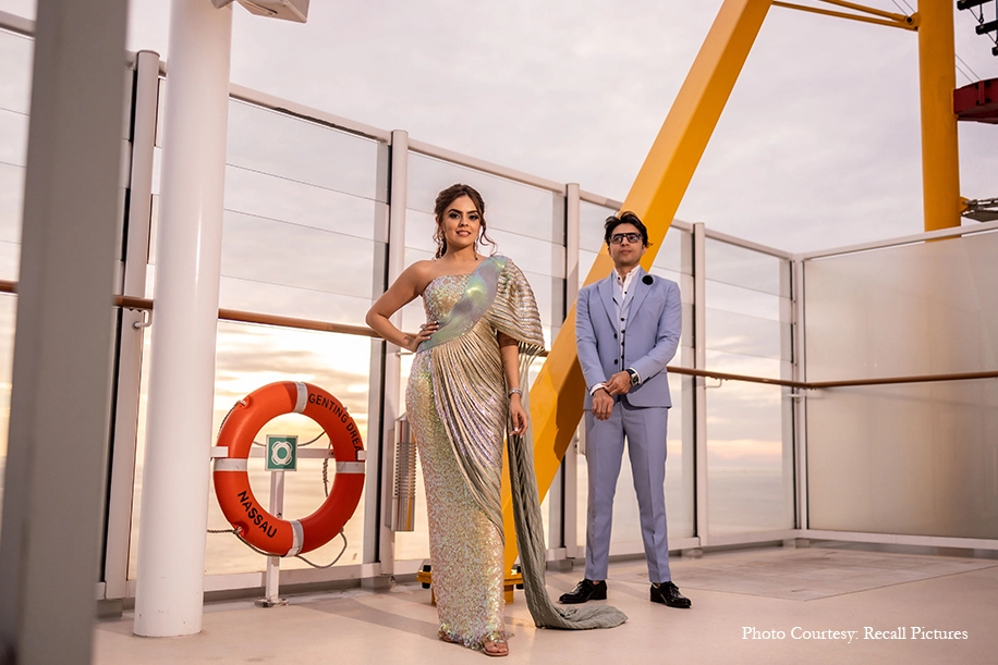 Simran Jagwani, a content creator and Ruchit Luthria, a businessman ensured their loved ones had a gala time celebrating their wedding on a cruise. Having tied the knot during the pandemic at an intimate wedding ceremony, the couple had always been keen on a grand celebration. Luckily, as the situation around the world became calmer and borders opened up, the couple roped in WeddingSutra Favorite – Krayonz Entertainment who understood the duo’s vision and planned a spectacular three-day celebration brimming with music, dance and cheer.