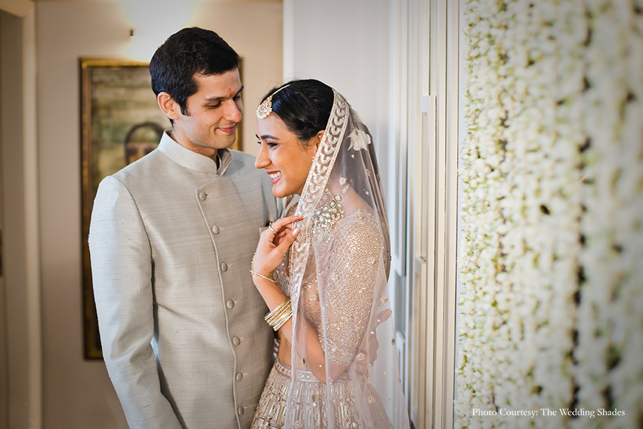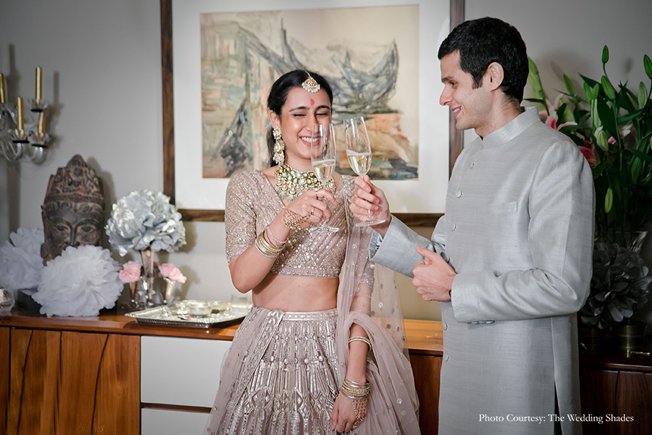 “I had already planned my outfits well in advance and placed an order for them in February itself. But with the pandemic throwing delivery schedules for a toss, it was through luck and the sheer determination of our designers that everything came on time and fit perfectly. In fact, my wedding outfit reached just three hours before the wedding! In Rishabh’s case, however, we were in utter panic as we hadn’t placed an order. But one of my designer friends saved the day as she gifted us a grey/sage hued raw silk achkan from her collection which fit him well and matched my outfit too!”
