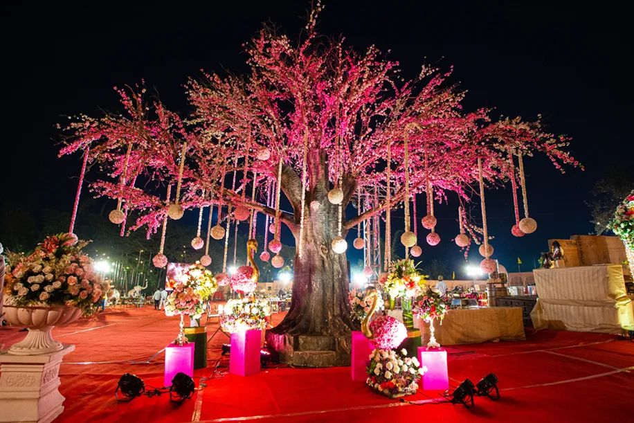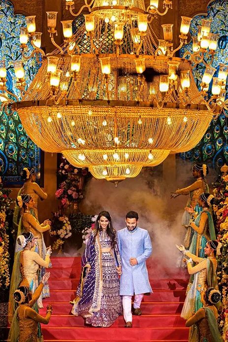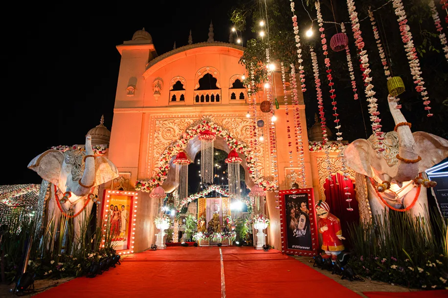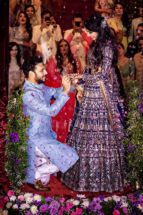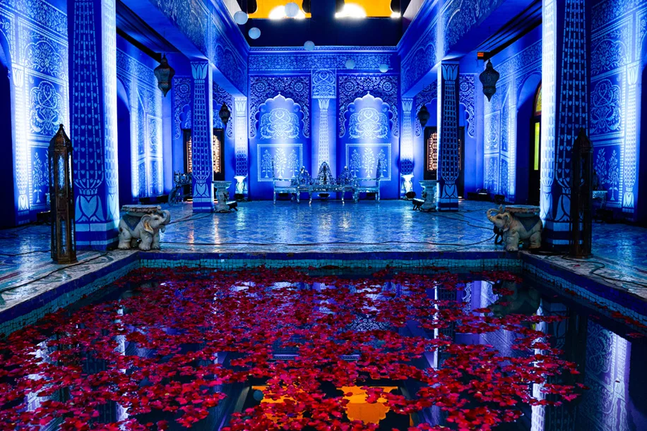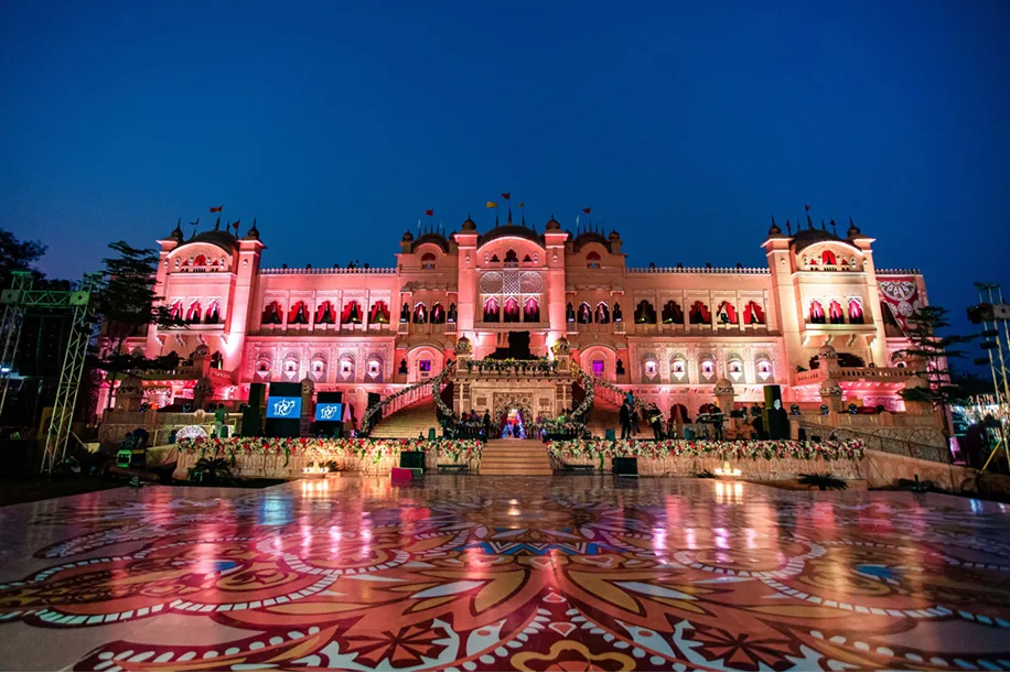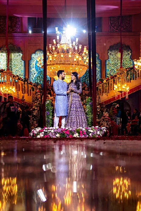 Aakash shares, “We literally brought Bollywood to life as we had celebrity doubles like Anil Kapoor, Salman Khan and Amitabh Bachchan to entertain and interact with the guests. For guest entertainment we also had an Illusionist playing his tricks on the audiences’ minds and leaving them amused. Another guest favorite was a 360-degree photo booth to capture memories along with a Nitrogen Bar to keep the guests well entertained.” And it didn’t just stop here! Aakash adds, “The Sangeet celebrated an IIFA awards ceremony theme. From changing backdrops and outfits to 3D dance performances, the entire event looked straight out of a Karan Johar movie! Between a few performances, we had the anchor handing over people awards to build up the excitement. Not to mention, the weather was on our side with the beautiful December winter rendering the evening perfect to host the entire Sangeet outdoors under the scintillating sky. To keep the grandeur levels high, the palace was kept as a backdrop for all performances. We created a larger-than-life staircase from the terrace of the palace to the stage that served as the perfect entry point for the couple. Over 150 background dancers and a 120 by 42 feet stage made this the perfect Bollywood sangeet.”