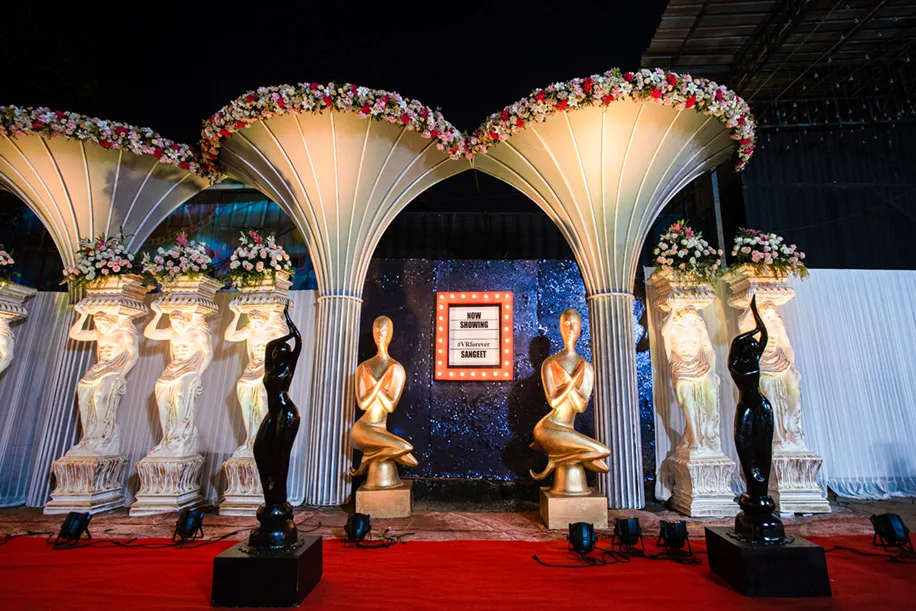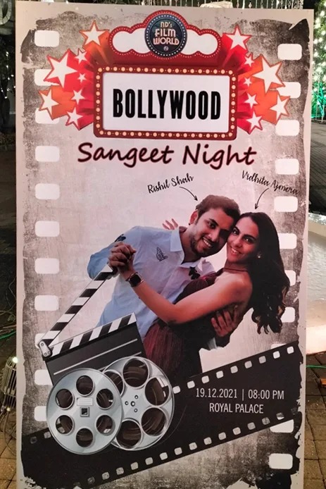 The impressive ring ceremony was followed by an extravagant outdoor Sangeet that appeared right out of a Bollywood movie, where the set was created with a bunch of florals and fairy lights for the entry arch. The entire palace was lit up with heavy lighting and sound to amplify the filmy vibes! The decor also played a major part to compliment the ‘Bollywood’ theme, along with guests who enthusiastically dressed up as iconic movie characters.
