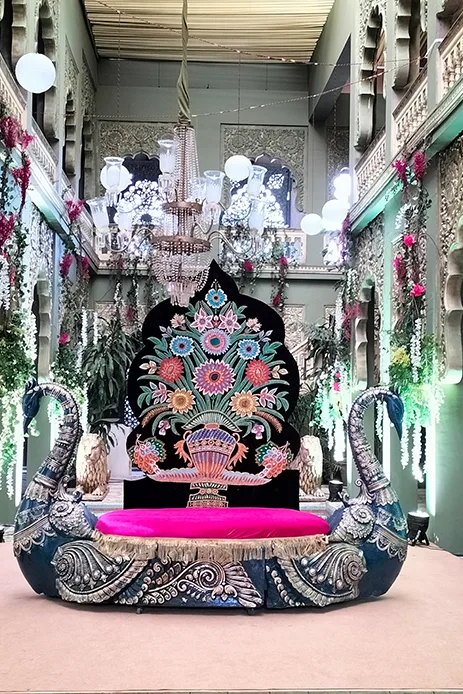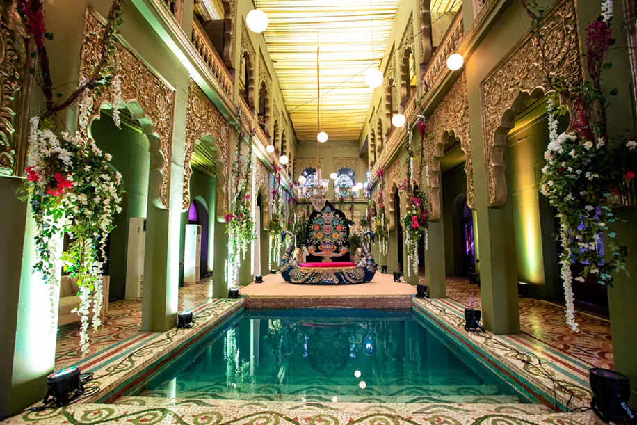 Describing precisely what the couple was looking for at their events and the brief they received, Aakash Doshi from Zest Events shares, “Our filmy couple, Vidhita and Rishil wanted a larger-than-life event to kick off the wedding festivities in full swing. For us, their wish was our command! Having planned and executed many events for the family in the past, we wanted to give them something that would firmly imprint itself on their memory.” He adds, “To match their personalities, we decided to host their pre-wedding celebration at ND’s Film World in Karjat which is conveniently a few hours away from Mumbai and took over the ‘Prem Ratan Dhan Payo’ set constructed within the venue. With their penchant for grandeur in mind, we designed an extravagant celebration that used the authentic elements present at the venue. Additionally, we added our own touches to it so that the entire family was treated to a Bollywood -style spectacle!”