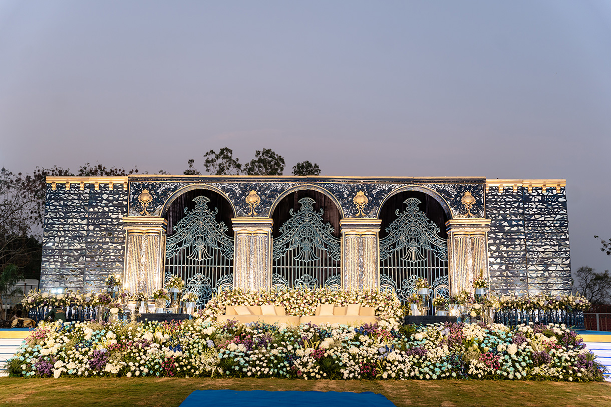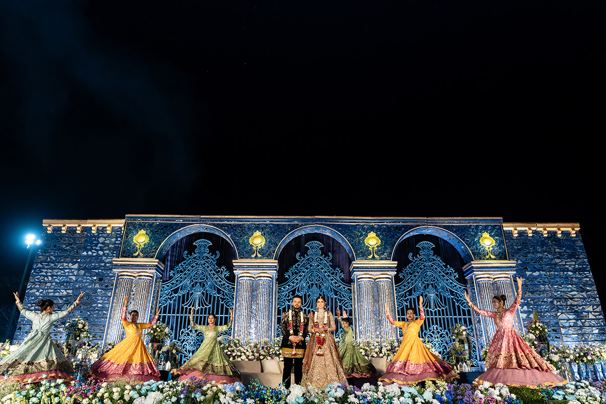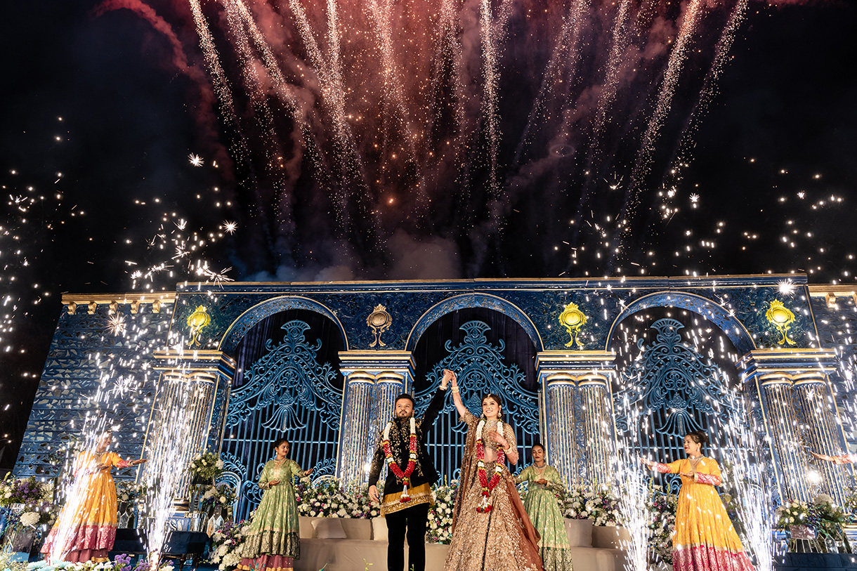 The grand finale, the reception, aptly named ‘Happily Ever After’, left an indelible mark. Pranal shares, “Drawing inspiration from Dior’s blue label prints, the evening featured a dramatic entry by the bride and groom. A spectacular fireworks display illuminated the sky, leading to a mesmerizing performance by a live band, ensuring the celebration concluded on a euphoric note.”