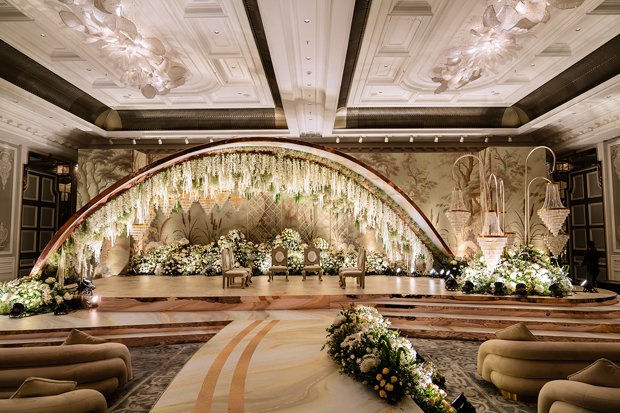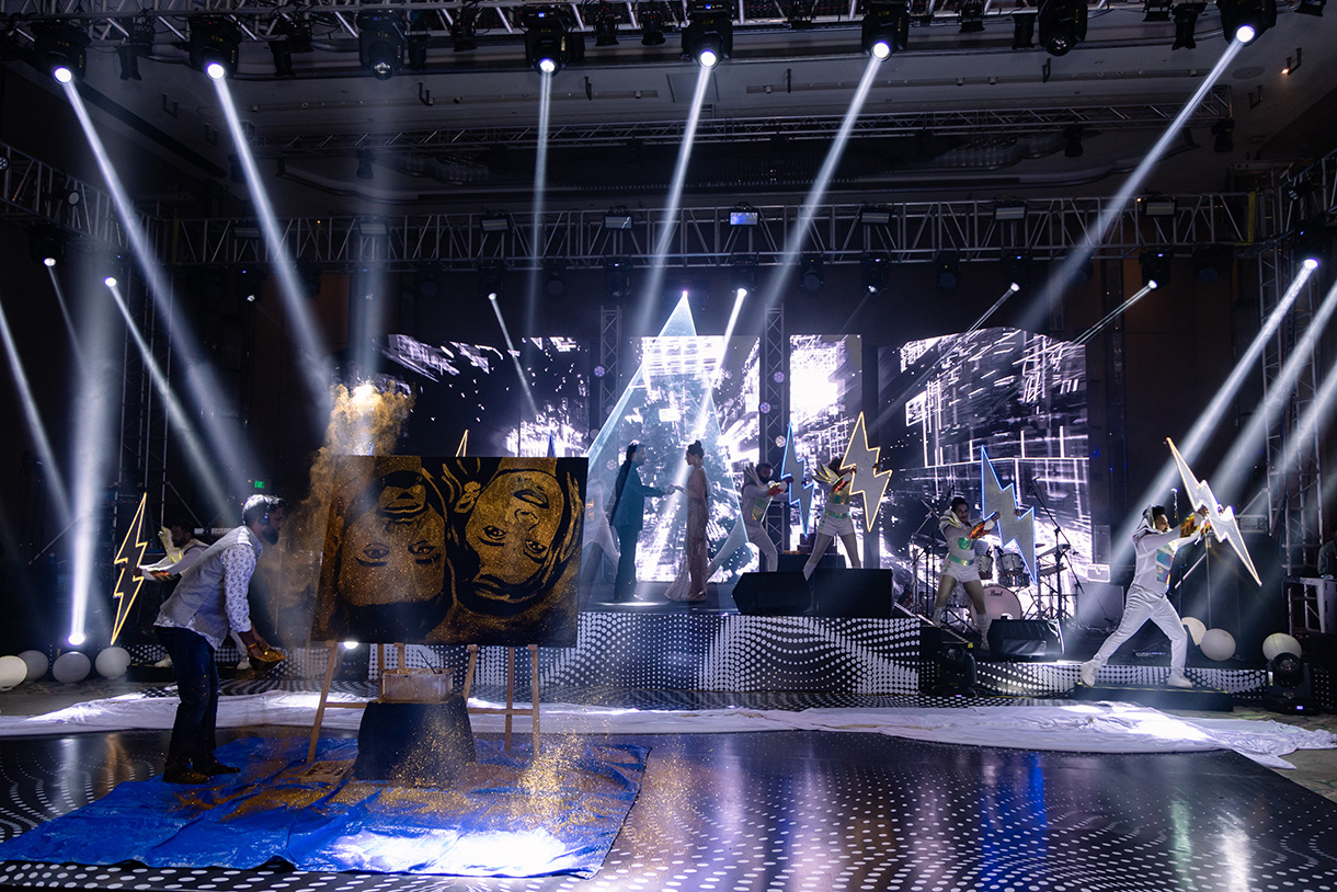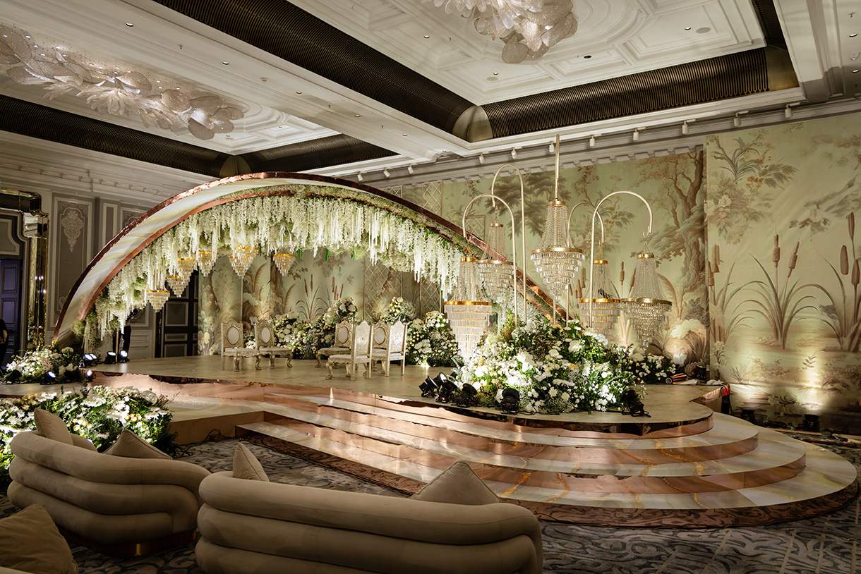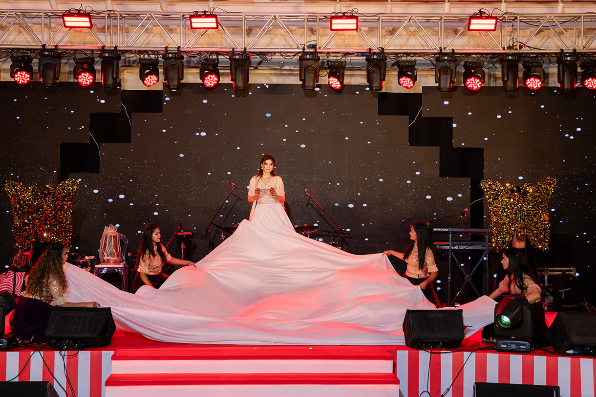 The journey commenced with ‘Sensation White’, a pre-wedding soirée held at a luxurious hotel. The evening captivated guests with a mesmerizing kabuki drop revealing the couple, followed by an instant painting session encapsulating the essence of their love in art. An emcee guided the evening, while a sufi band’s soulful melodies set a captivating tone. Inspired by Kashmir’s ethereal beauty, the ‘Echoes of Pashmina’ theme enveloped the venue, complemented by the soulful tunes of a Rabab artist, transporting guests to the serene valleys of the North.