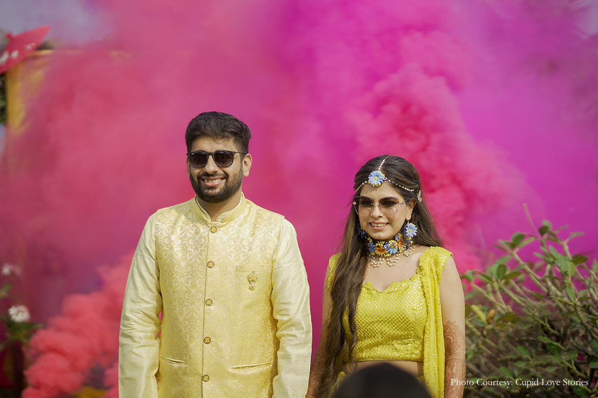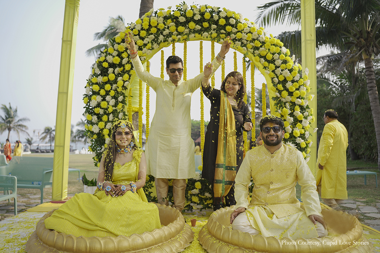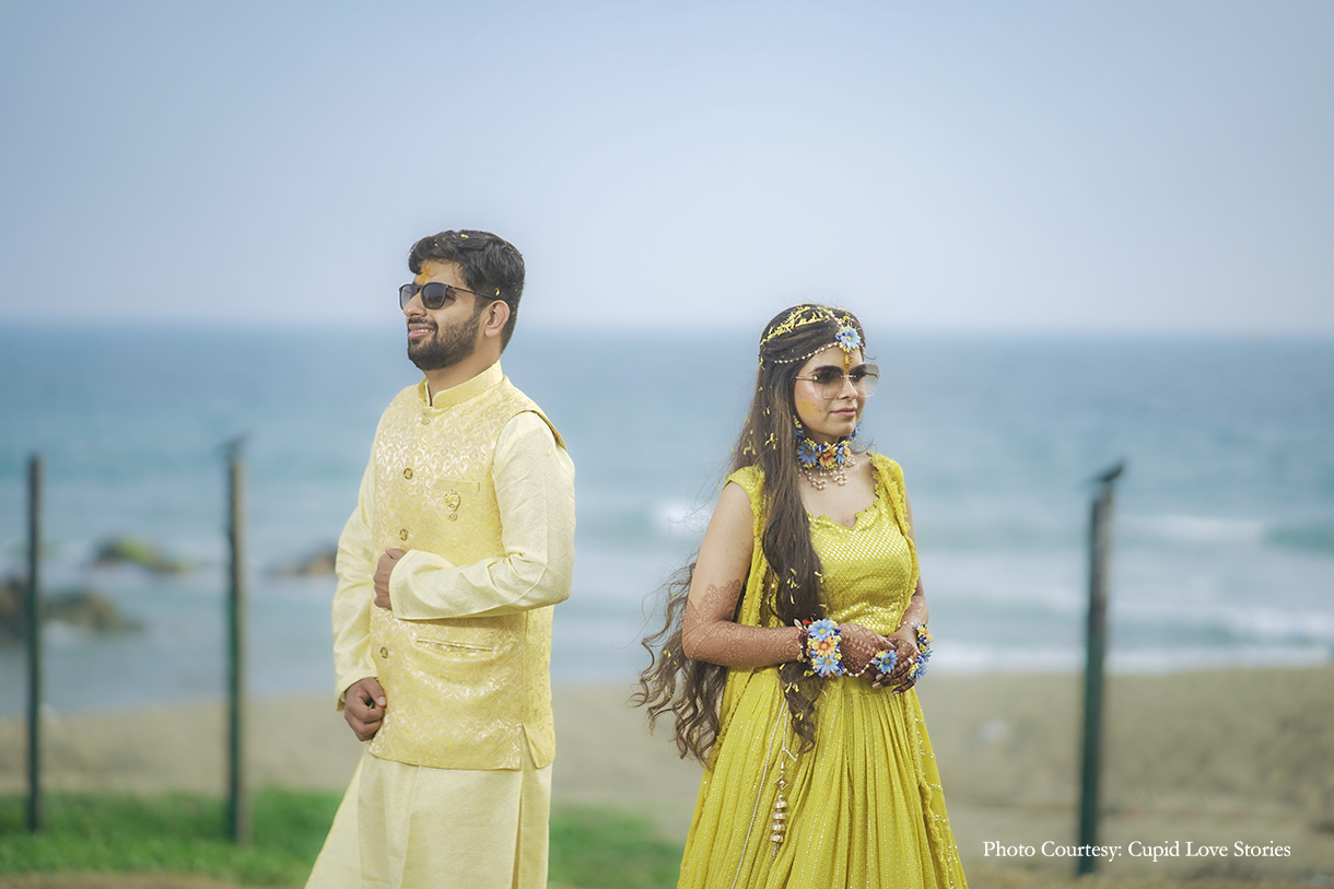 The festivities kicked off with a vibrant haldi soiree full of fun, lively moments. Imagined with the sunkissed decor of yellow and white, the intimate function painted a vivid picture against the azure blue sea. Dressed in hues of yellow, the couple made a stunning entrance amidst puffs of colorful smoke.