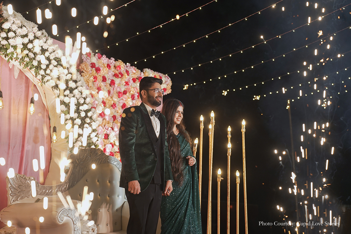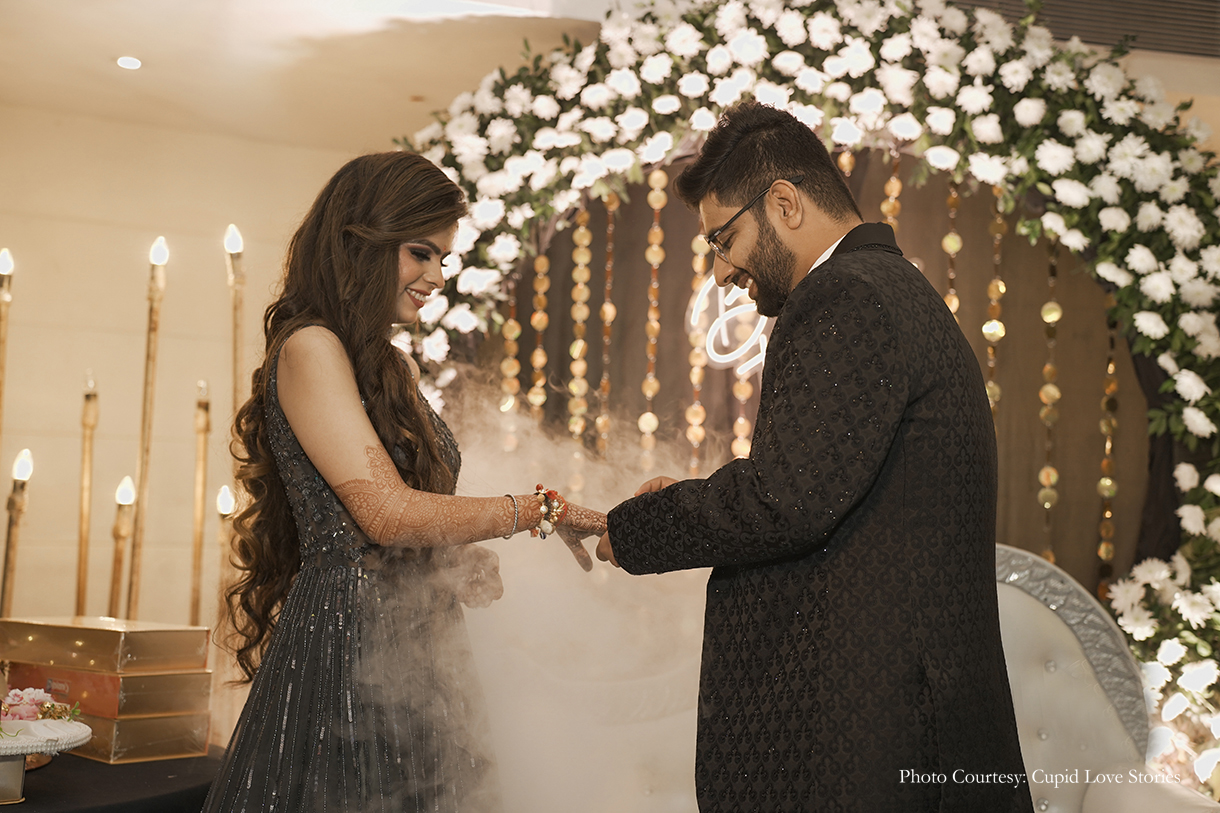 Stepping things up with a dose of glamor, the engagement evening was bling galore. The decor of white drapes and flowers came together with golden tinsel and tons of candles to set a magical ambiance. The couple exuded elegance as they exchanged rings before dancing the night away with their loved ones.