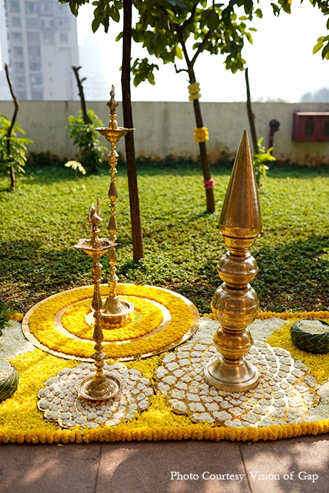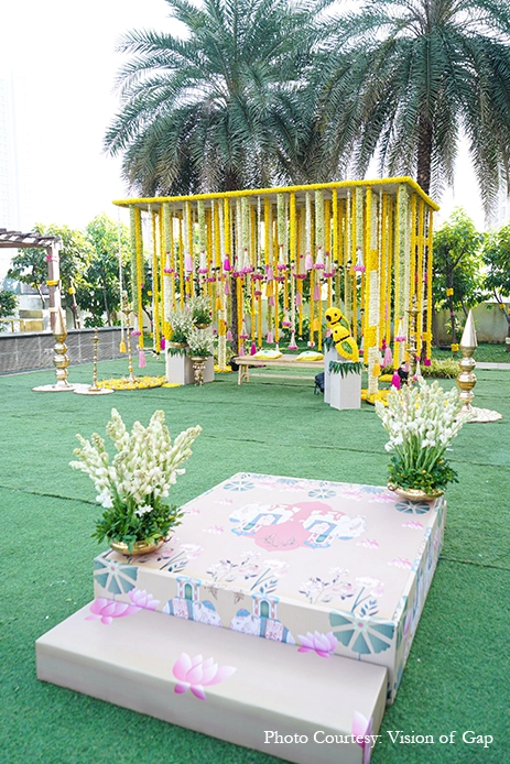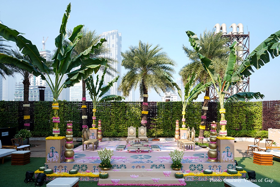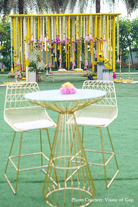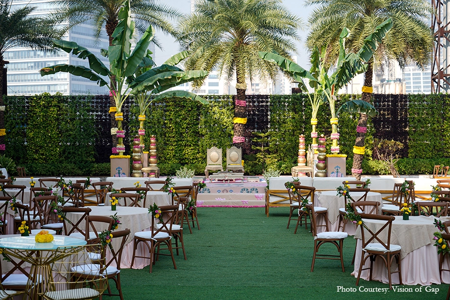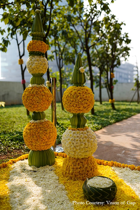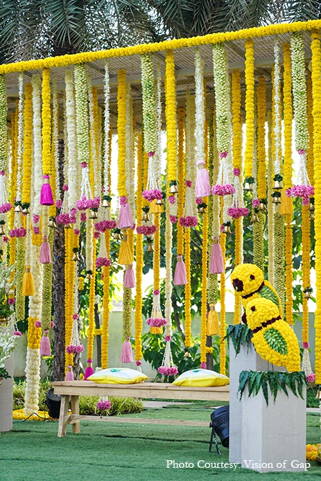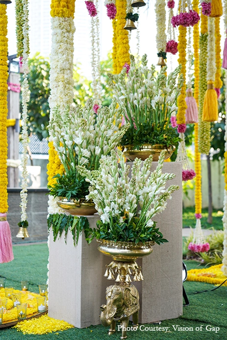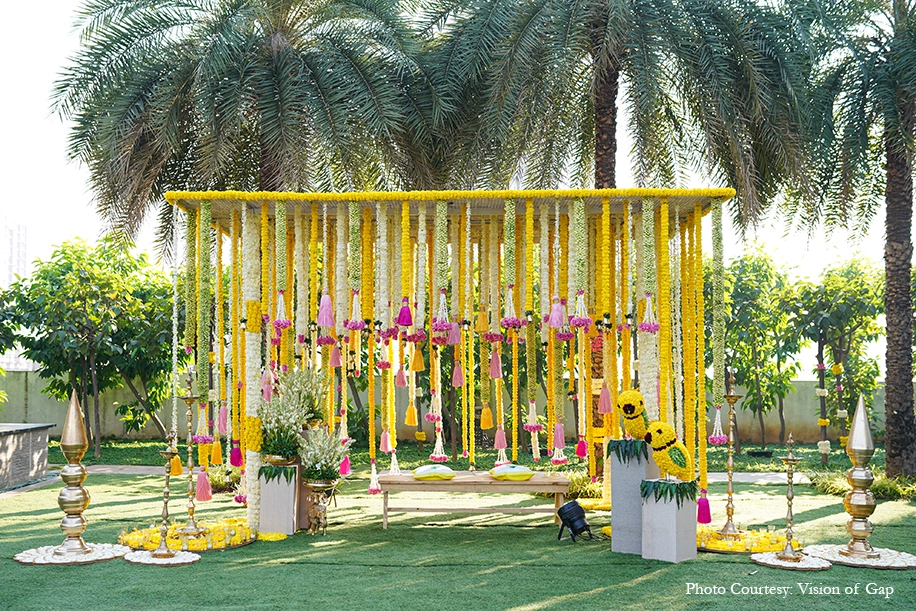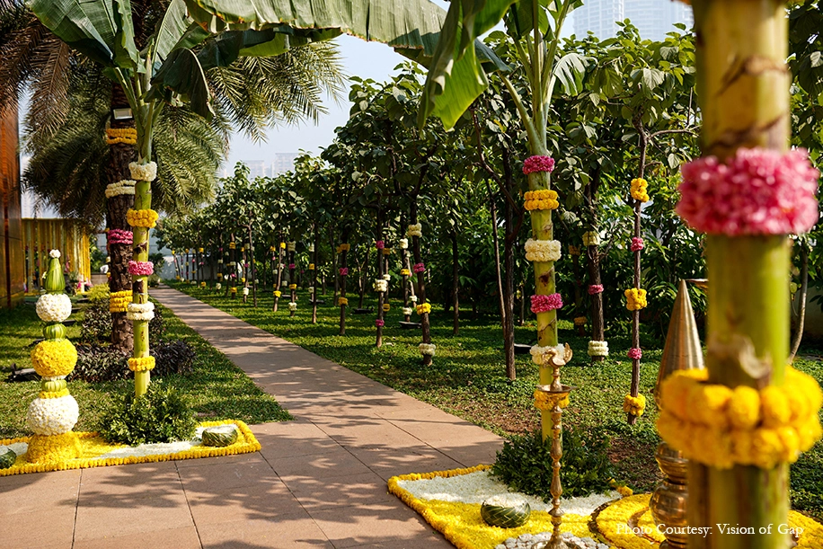 The outdoor wedding looked heavenly with its nature-based elements that blended with the venue. Acrylic rangolis adorned with brass diyas perked up the corners while traditional urlis with tuberoses livened up the atmosphere. A pair of parrots crafted out of marigolds added some quirk to the traditional decor while organic banana trees surrounded the mandap, and the guests were greeted in a colorful manner with a walkway crafted out of marigold bands with regal gold accents. Scattered across the venue were canopies of blooms that were accentuated by bells that tinkled gently in the breeze and colorful handcrafted tassels that added a pop of color.