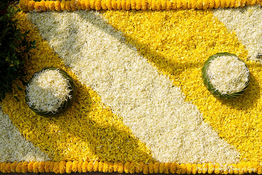 This couple’s intimate outdoor wedding resembled a floral paradise with its canopy of blooms, flower rangolis and handcrafted leaf baskets