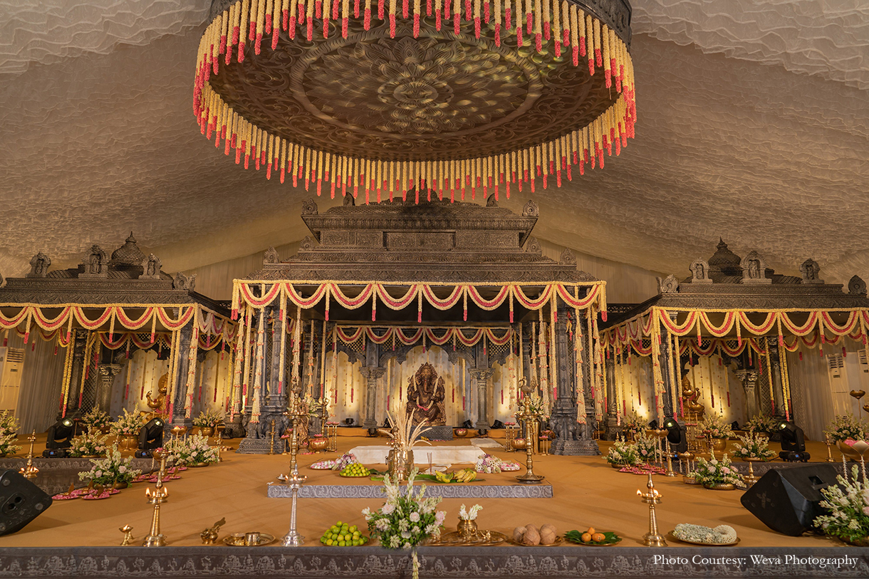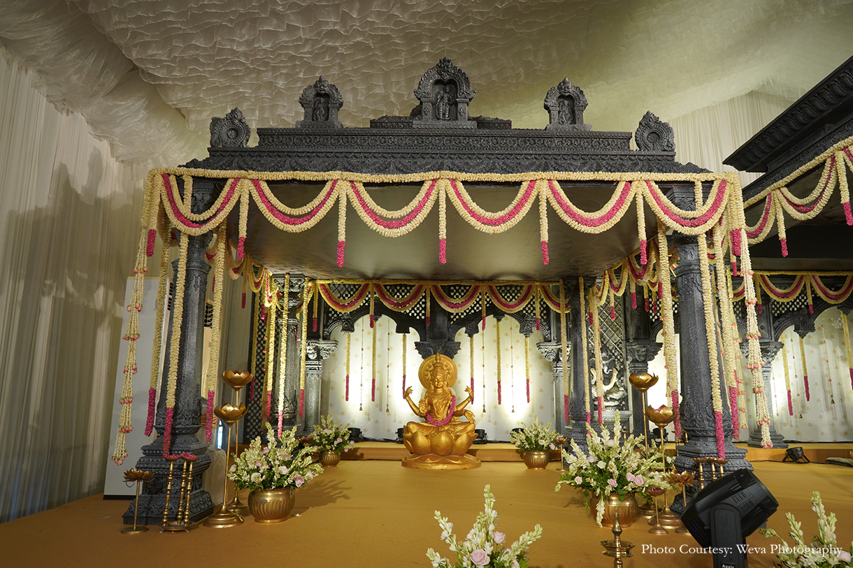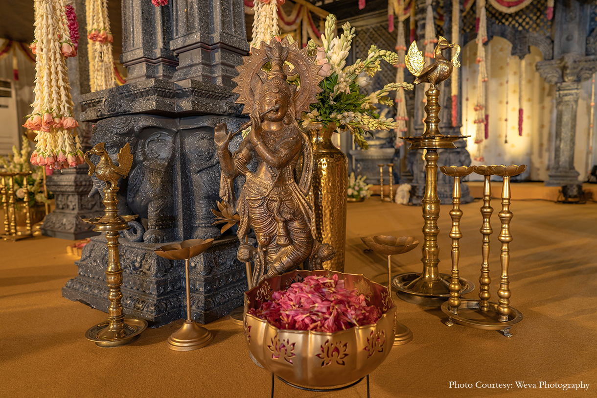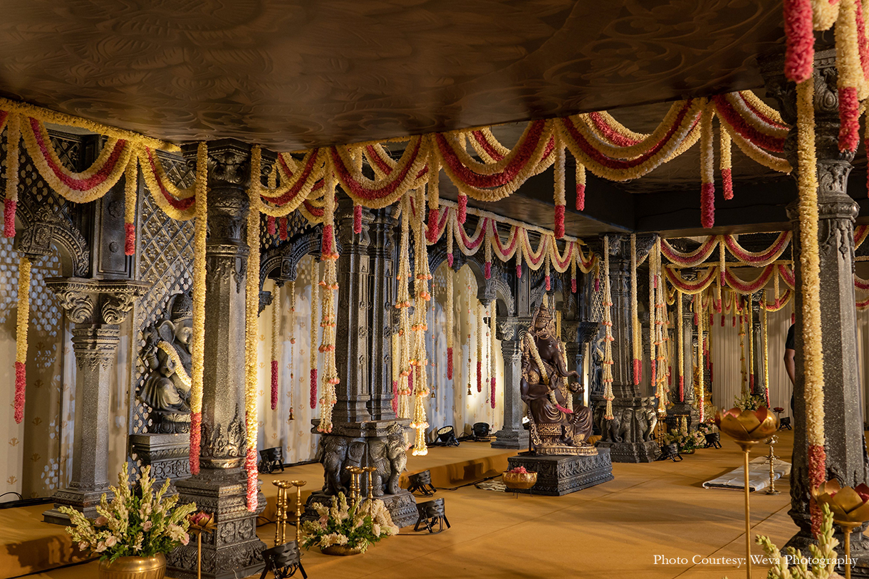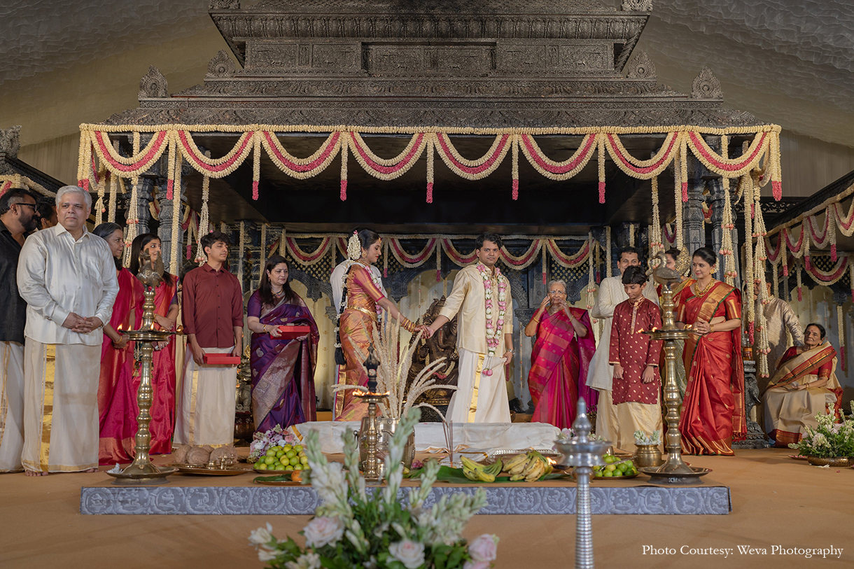 For planning and designing the wedding, Parvathy and Shashank chose Watermark Weddings who understood the brief precisely. As ardent admirers of classic stone temples that exude majesty, the couple were keen on a setup resembling the heritage Mahabalipuram Shore Temple, one of the oldest structural stone temples in India. Spurred by the duo’s vision, Watermark Wedding crafted a traditional wedding with a touch of the divine. Classic Indian elements were presented in a new-age manner seamlessly. Tunes of classical Carnatic music played by U. Rajesh, popularly known as Mandolin Rajesh, made the celebration even more magical.