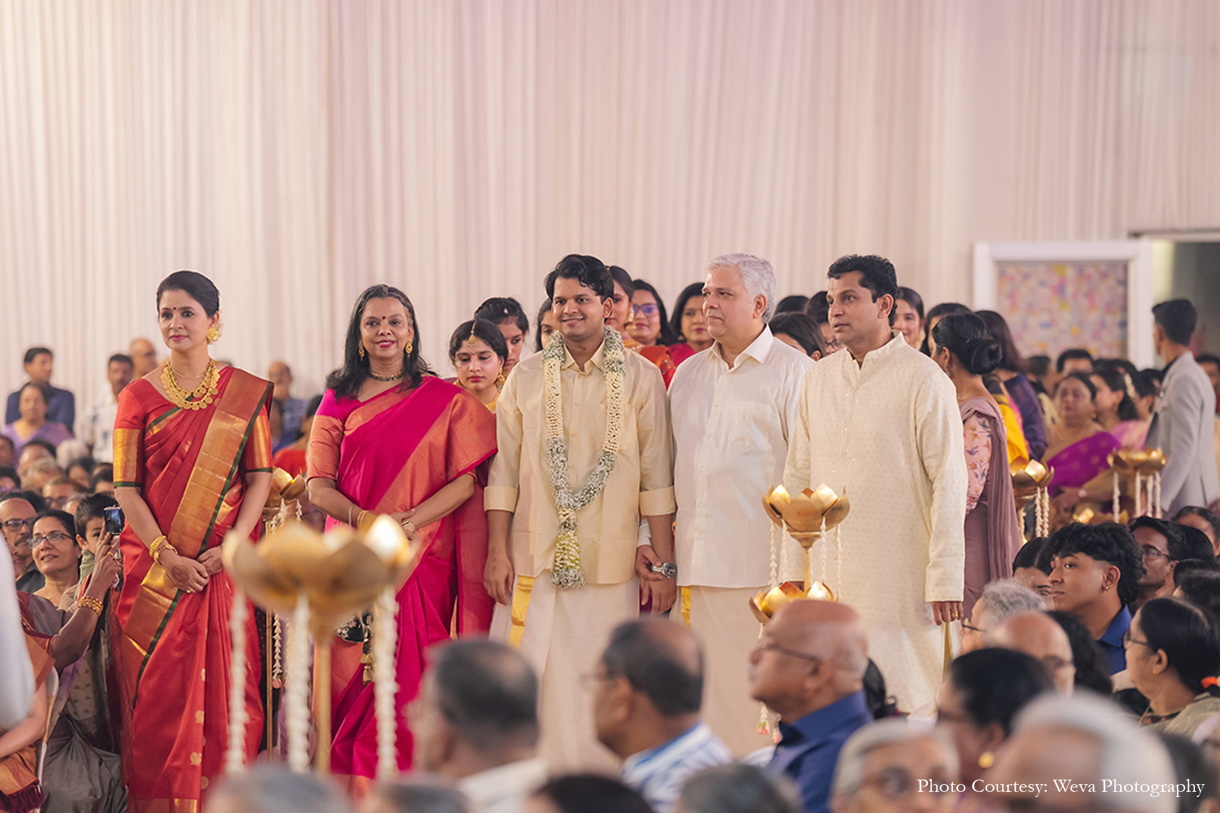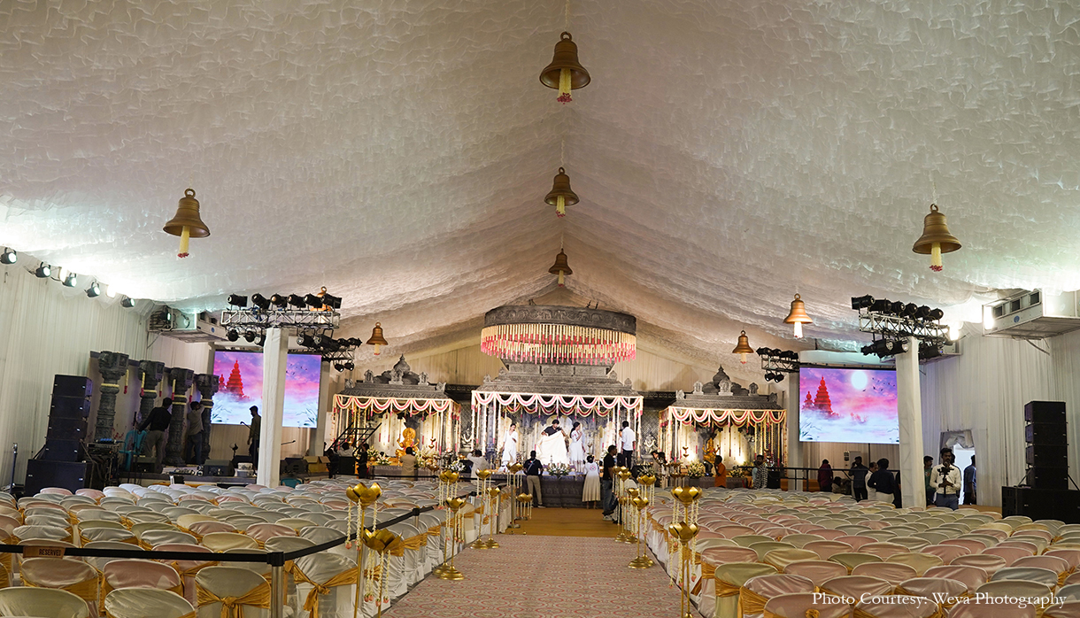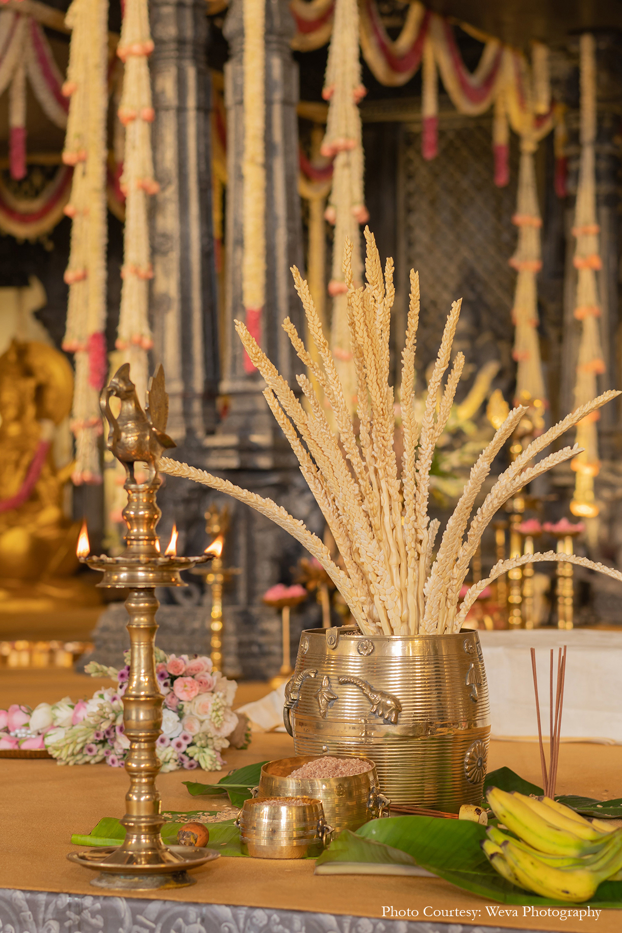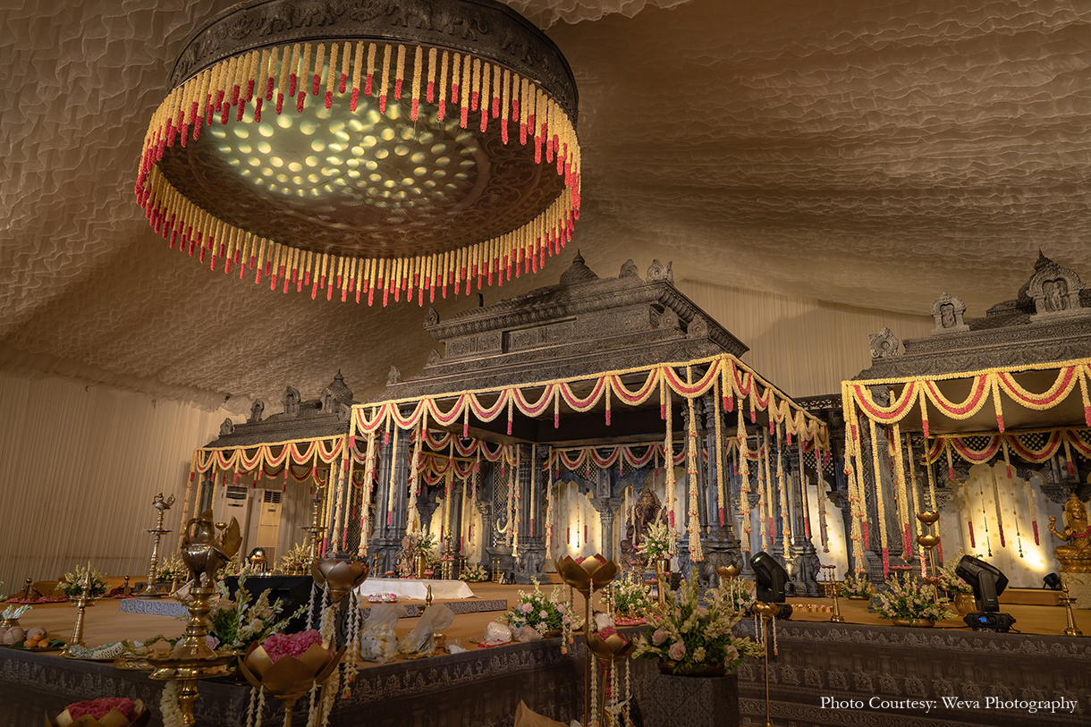 For planning and designing the wedding, Parvathy and Shashank chose Watermark Weddings who understood the brief precisely. As ardent admirers of classic stone temples that exude majesty, the couple were keen on a setup resembling the heritage Mahabalipuram Shore Temple, one of the oldest structural stone temples in India. Spurred by the duo’s vision, Watermark Wedding crafted a traditional wedding with a touch of the divine. Classic Indian elements were presented in a new-age manner seamlessly. Tunes of classical Carnatic music played by U. Rajesh, popularly known as Mandolin Rajesh, made the celebration even more magical.