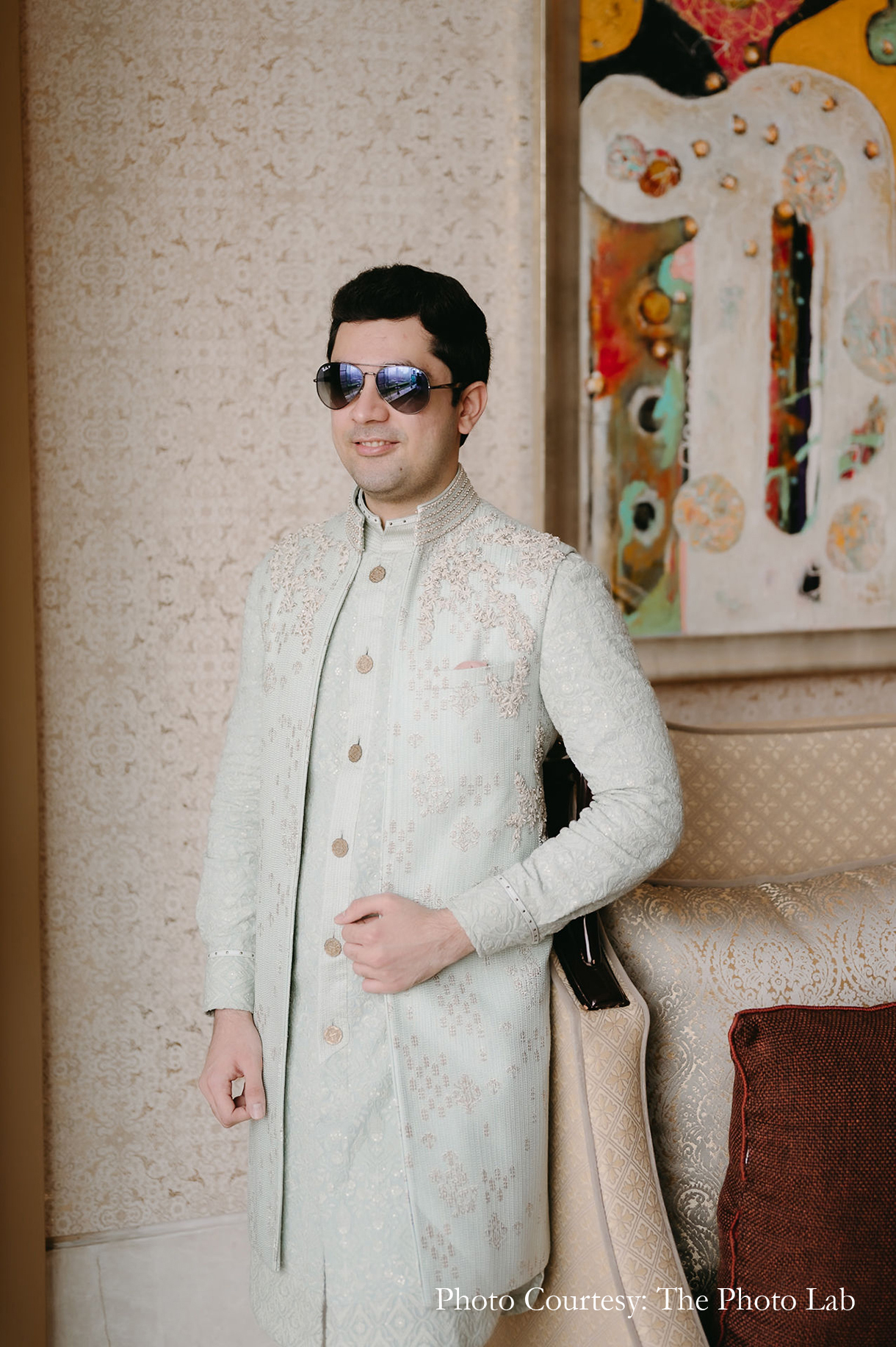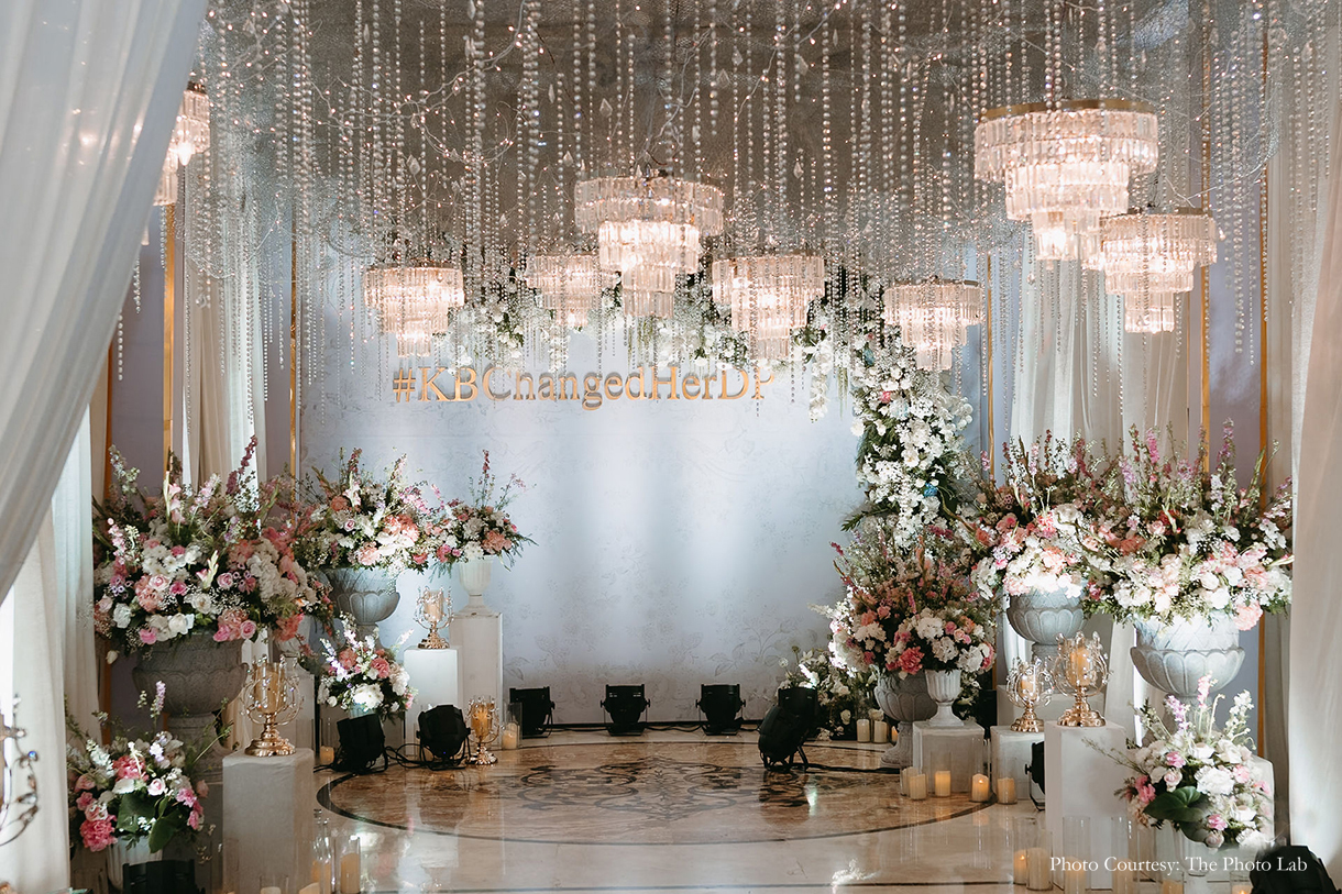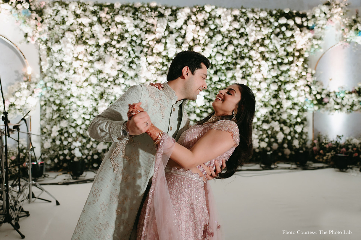 Every detail was meticulously curated echoing the duo’s love for minimalism. Krisha shares, “From the very beginning we have loved everything dreamy and elegant. ‘Minimal Magic’ were the keywords we used while briefing our team and we also wanted to incorporate small personal touches throughout the design. The photo-op at the entry had the guests clicking selfies and the walkway was adorned with chandeliers. And, once the guests moved inside they were greeted by hues of green, ivory, white, silver and gold. As gorgeous as the decor was, the bar was equally beautiful and personalized. The entire bar setup was customized. The team used our invitation designs as an inspiration to craft customized coasters, menus and stickers. Stirrers also sported our wedding hashtag! A top favourite was the Chocolate Espresso Martini and the ‘Bubbly Bar’ with a variety of Champagne-based drinks!”