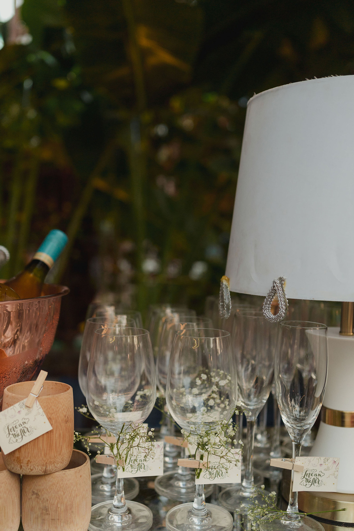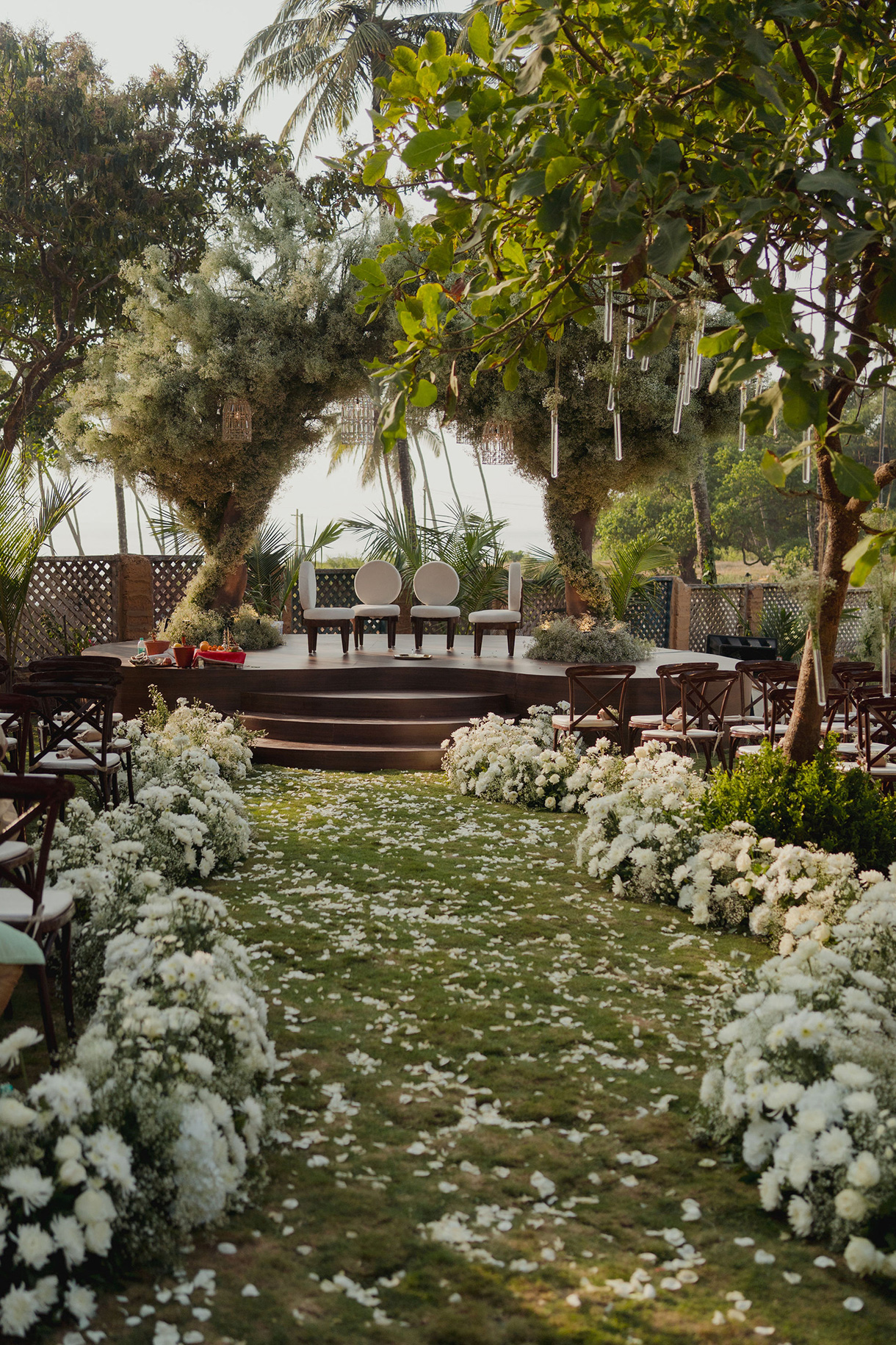 He then went on to give us an in-depth explanation of what went on behind the scenes to make the couple’s vision come to life, “The entire venue for the mandap was created from scratch by bulldozing and getting the landscape on one level. The phera venue was also infused with a beautiful glass house with a specially designed deck for food and beverage. We focused on a blend of nature-inspired elegance and minimalistic charm to complement the venue. The stage was sketched and developed taking inspiration from the curves of the swimming pool, avoiding any rigid traditional structures. Plus, the wooden texture of the stage enhanced the natural beauty of the outdoor space. Baby’s breath and white blooms were generously added keeping the bride’s preferences in mind. The unique wedding mandap weaved a story of two trees blending in harmoniously to create a beautiful installation that we aptly named ‘Sacred Symphony’.
