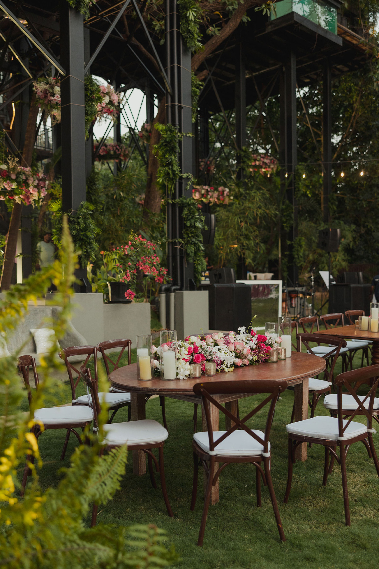 Hanging birdcage chandeliers added depth and created a warm, romantic evening. Petite ornaments suspended from existing trees made the entire setup come together. Instead of a straight aisle, we chose a curvy aisle with florals and greenery, transforming the entire area into a lush garden.”