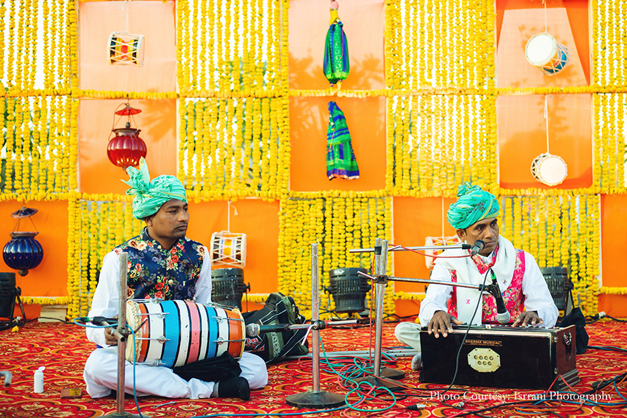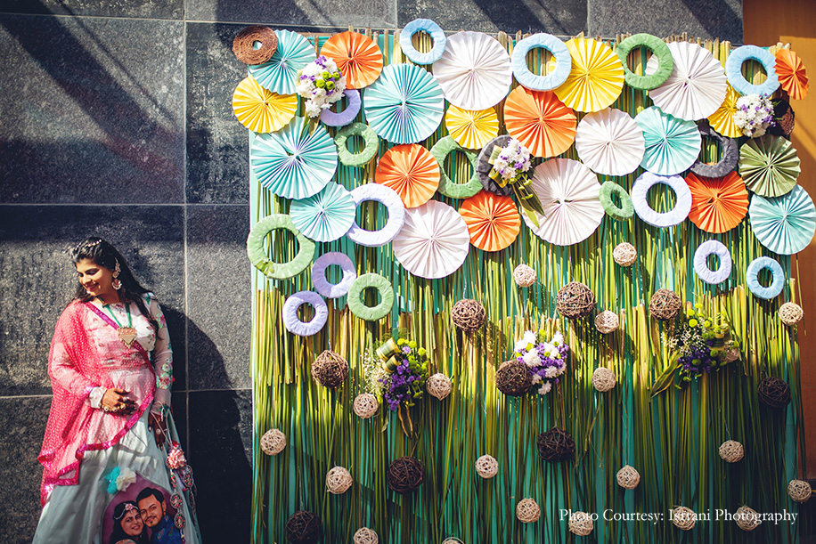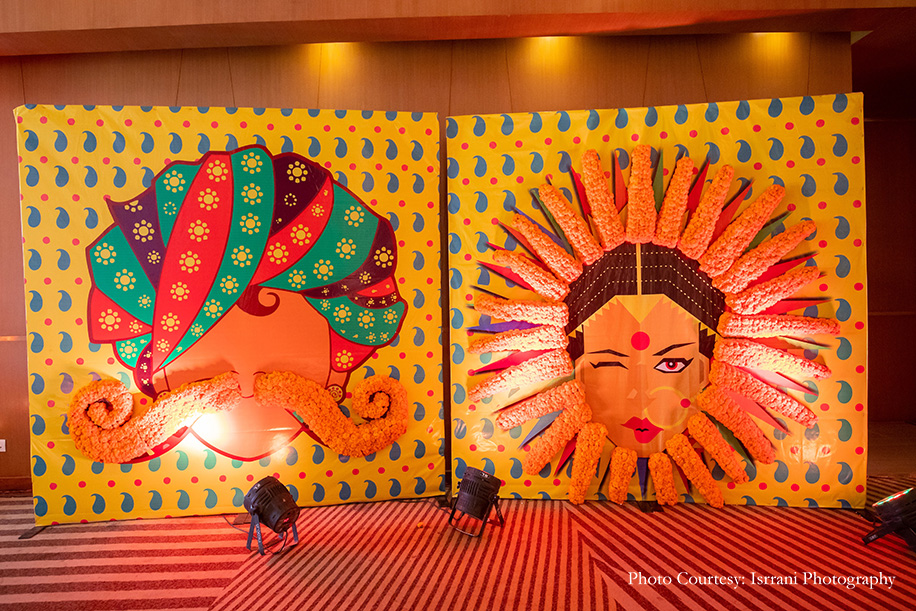 Next in line were the welcome parties thrown separately by the groom and bride’s side. Decorated with vibrant blooms and colorful canopies, the groom’s ‘Carnival’ themed welcome party was a smashing hit as Ashish was welcomed by popping multi-hued smoke bombs. The event was also punctuated with a live band performance that had everyone tapping their feet. For her welcome party, the bride chose rich hues of orange, green, and yellow to include in the decor which also had a touch of quirk all thanks to the eye-catching pop-art backdrop.