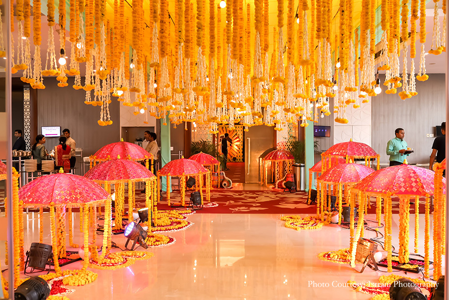 This couple’s wedding echoed the vibrancy of Gujarati culture with its gold archways and vintage chandeliers.