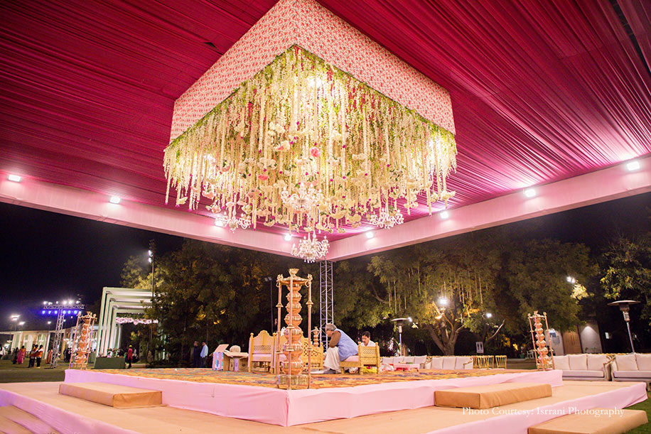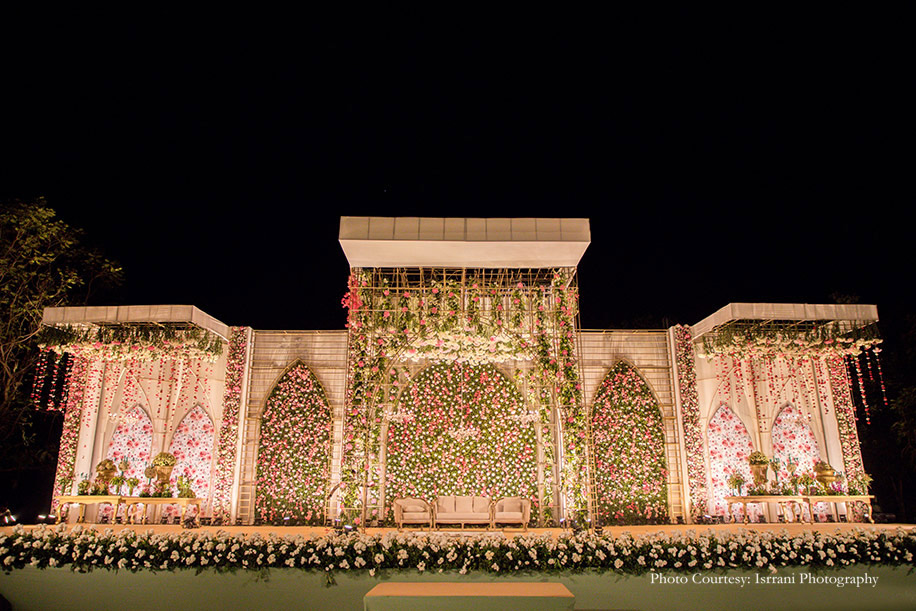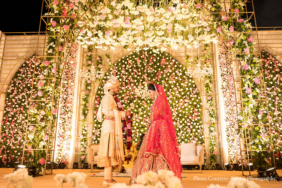 With traditional dancers heralding the gorgeous bride’s entry, calling the couple’s wedding a grand affair would be an understatement. Swathed in hues of delicate green, gold, and pastel pink the decor echoed their personalities and complemented the lush lawn perfectly. Shining brightly under the dark night sky, the spacious mandap, however, was the highlight of the evening with a ceiling thronged with delicate blooms and crystal chandeliers that cast a golden glow over the couple as they took their pheras. Glowing in a ruby red, intricately embroidered lehenga, Nidhi radiated happiness as she smiled lovingly at Aashish, who wore a gold embroidered sherwani for the occasion. Following the same color palette as the wedding, was the reception which witnessed the newlyweds mingling with the guests freely, as they accepted their blessings.