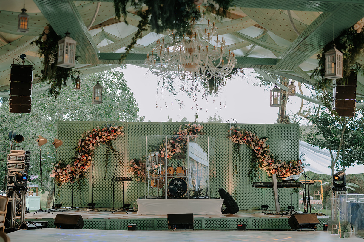 The energy peaked at the Sangeet, a dynamic Techno Jungle spectacle. Enveloped in cascading foliage and bold, electric lighting, the space pulsed with wild energy. Neon installations, tropical projections, and avant-garde floral hoops gave the event a playful, futuristic vibe, perfectly echoing the couple’s love for music and movement.