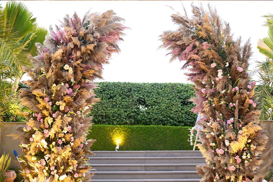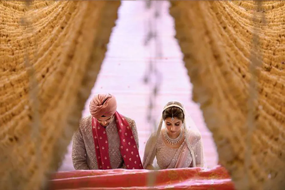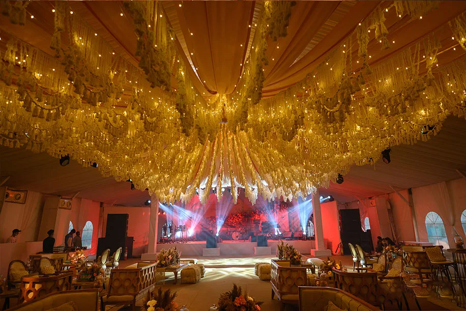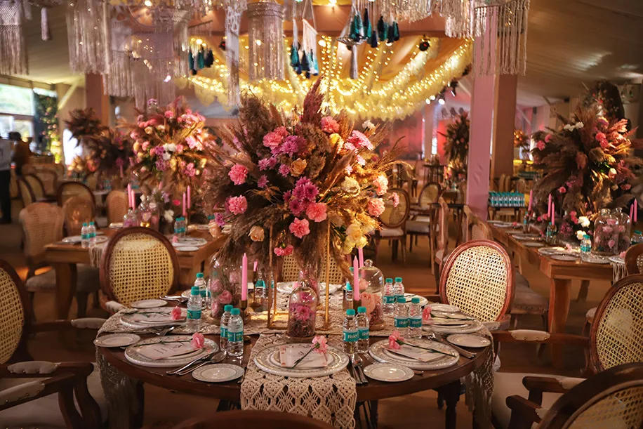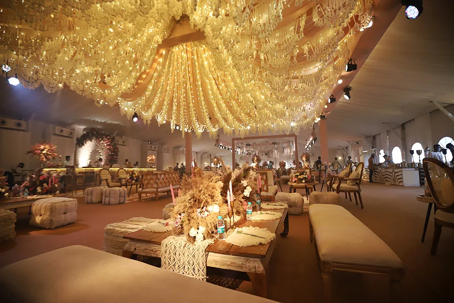 The festivities kicked off with a contemporary Mehendi soiree brimming with bohemian charm. A canopy of macrame and fairy lights, wooden furniture, crocheted table runners, pampas grass, and more cast a rustic barnyard ambiance for the occasion, while pops of bright colors with flowers, foliage, and other artistic elements elevated the energy. Lisa Mishra’s melodious performance set a magical mood for the evening.