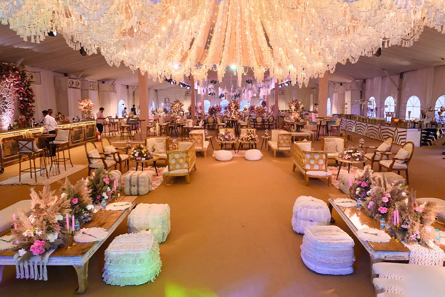 Designed in a pristine color palette of white and gold inside an outdoor marquee, the Sangeet function was a portal to another world. Clouds of baby’s breath interspersed with chandeliers hung overhead while sleek gold decor came together with white roses, candlelight, and lush foliage to create an ethereal atmosphere. The groovy jamming of Astha Gill and Sukhbir pepped up the crowd for an unforgettable evening full of music and dance performances.