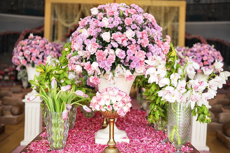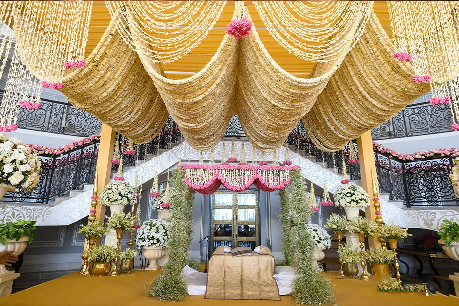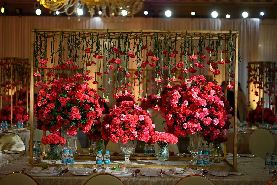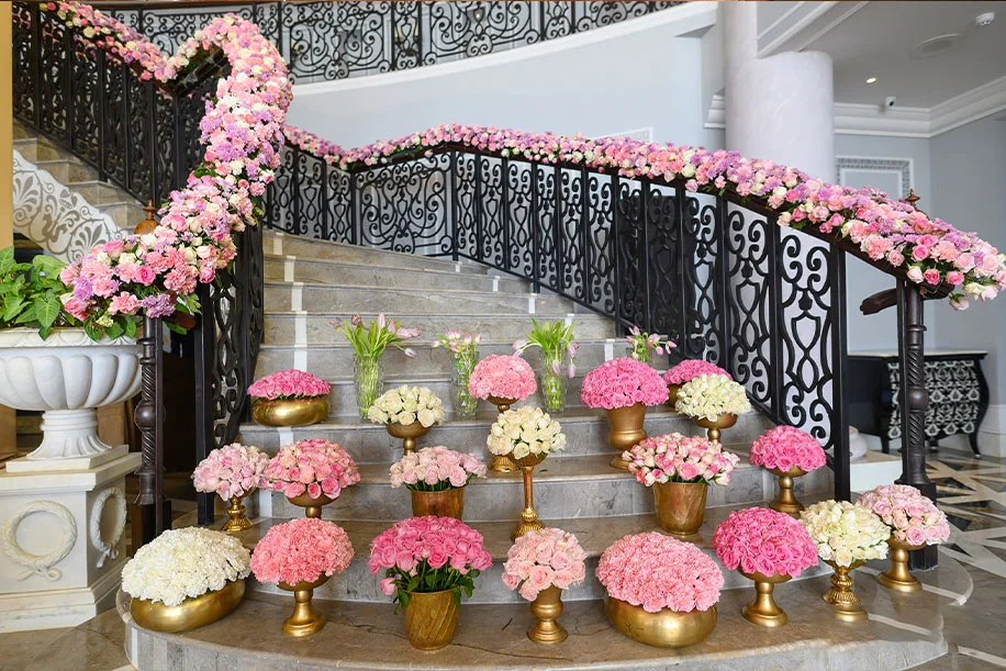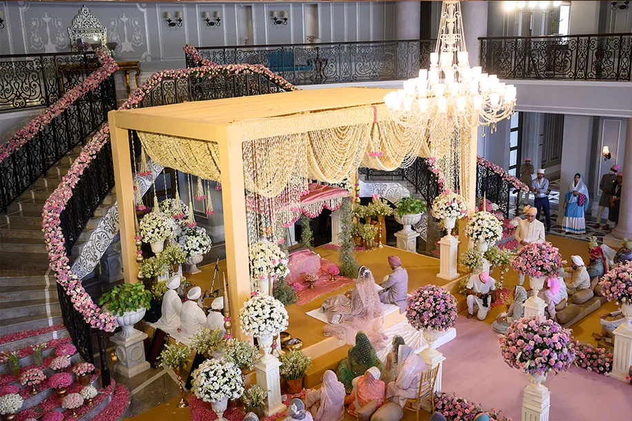 The Anand Karaj ceremony saw a transformation of the hotel lobby and grand staircase into a pastel pink wonderland, imagined with breathtaking floral arrangements and a plush canopied altar. Jonita Gandhi’s sublime voice graced the wedding lunch, while a profusion of red and pink roses elevated the formal table seatings. The wedding toast was the highlight of the occasion where the bride and groom popped the champagne from the balcony overlooking all the gathered guests cheering them on from below.