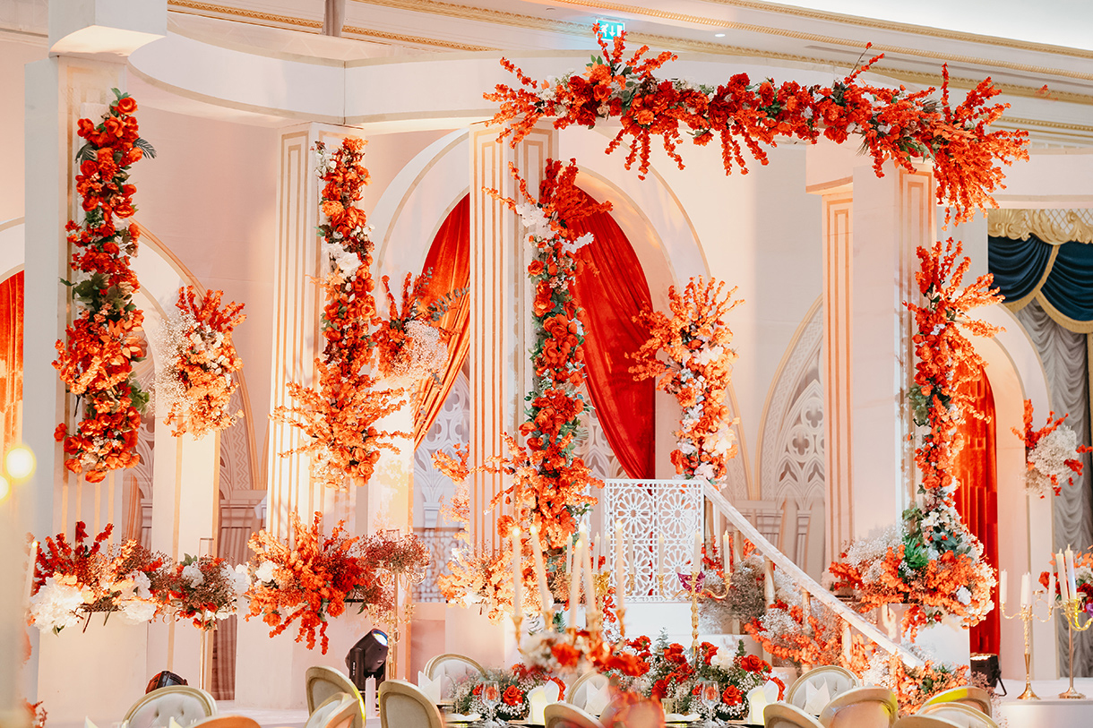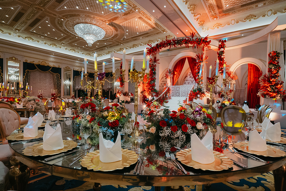The majestic ballroom of Raffles The Palm Dubai was the perfect setting for their French Venetian-themed welcome dinner. The venue in itself embodies a French aesthetic with its gold accents, pristine whites, and stunning chandelier. Rich arrangements and lighting in hues of red added a sumptuous touch to the evening, while ornate masks, custom desserts, and more added to the magic of the masquerade theme. The seamless blend of the venue’s inherent style with the meticulously planned decorations created a sophisticated and magical atmosphere, leaving a lasting impression on all attendees.