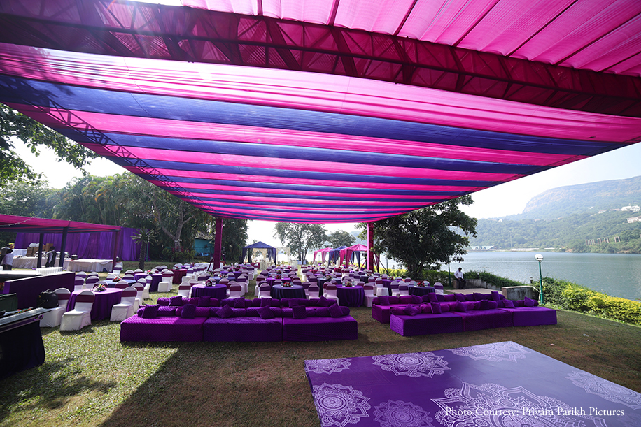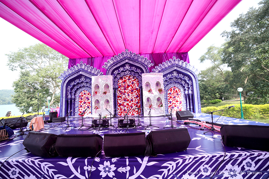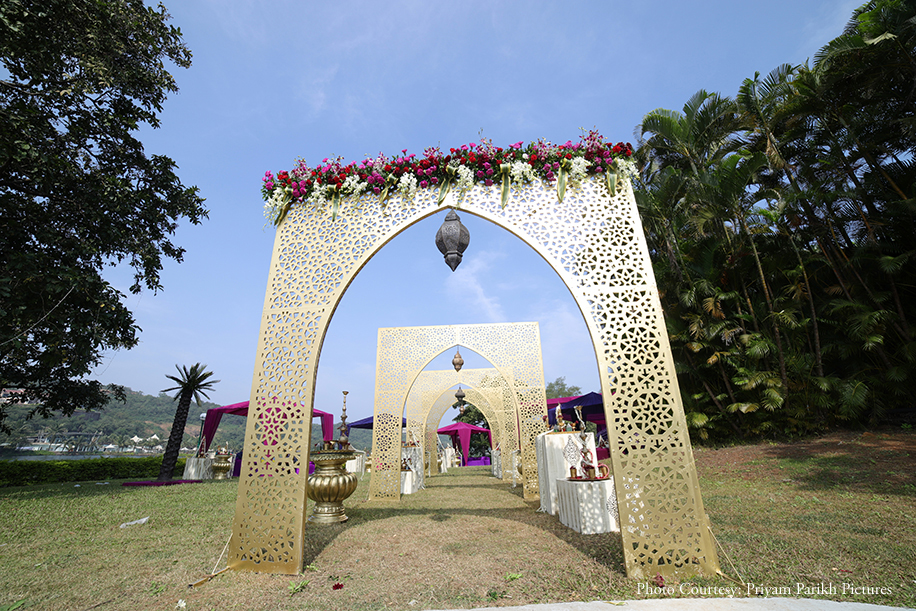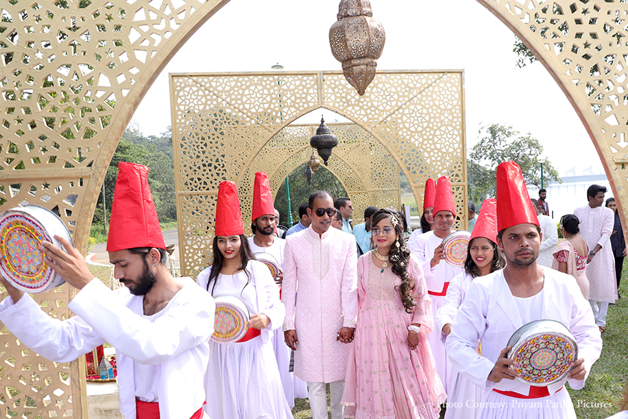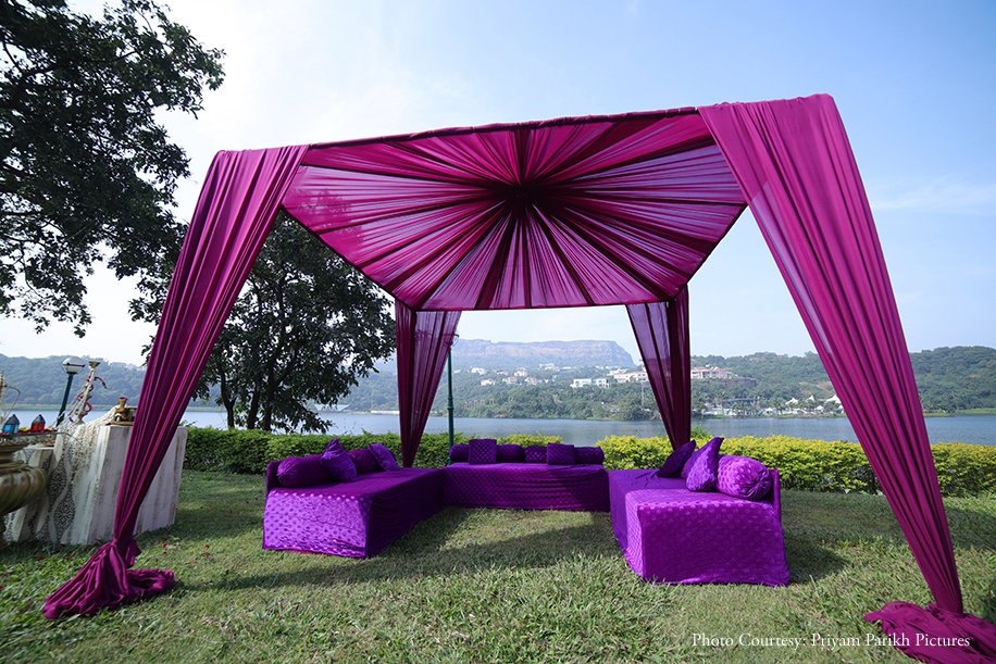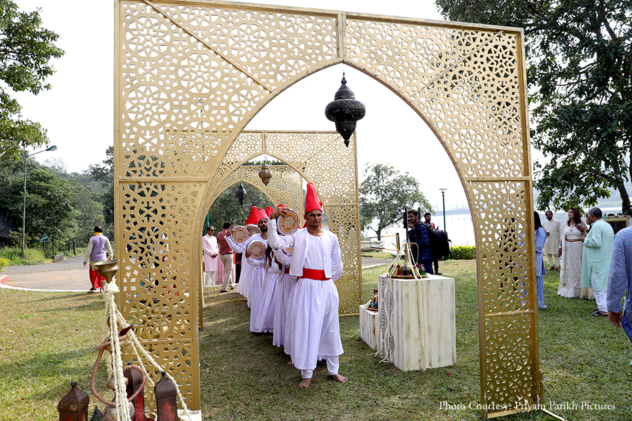 As everyone checked into the Aamby Valley Resort, the first event welcomed the guests in true Nawabi style. The enchanting performance of the Sufi dancers beckoned everyone into the magical ambience, peppered with purple and gold. Authentic qawwali entertainers followed the performance, serenading the guests as they enjoyed the delectable fare. The couples and their guests were dressed in beautiful tones of violet and pink as they swayed to the magical experience. It was a beautiful sundowner event for all who were present there.