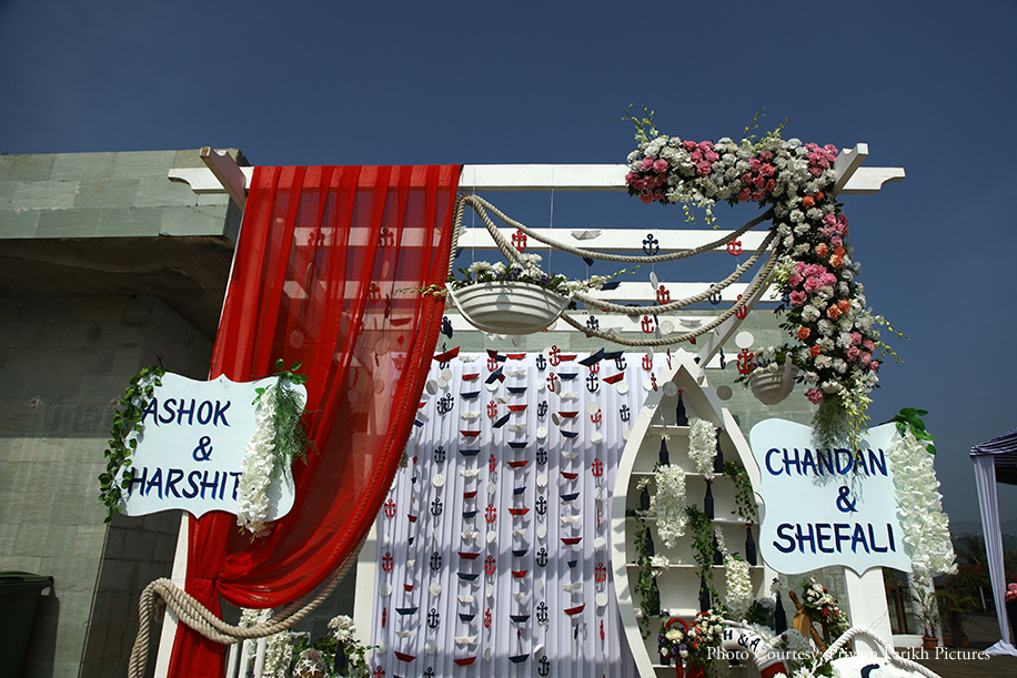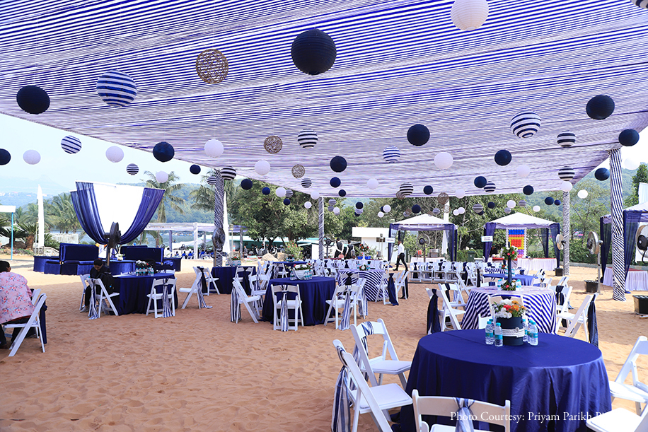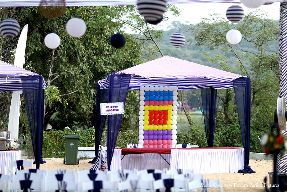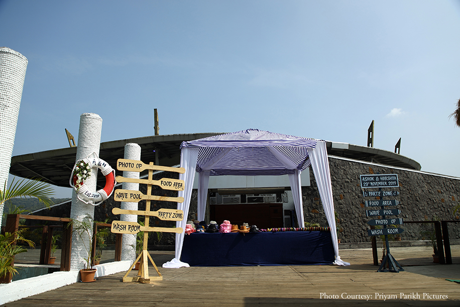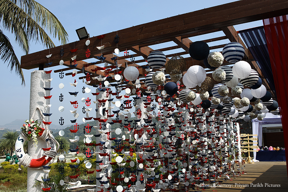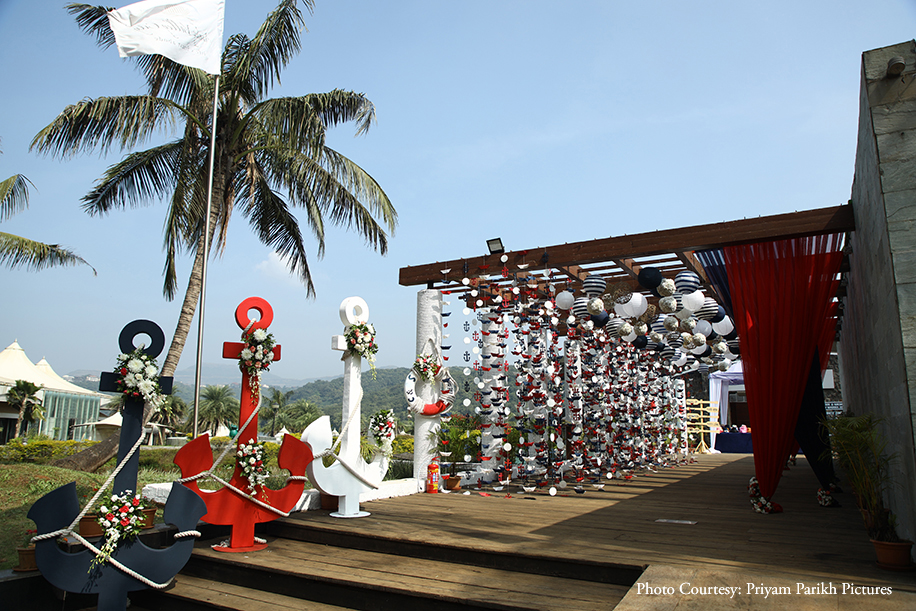 The first day was decked for the fun and frolic of the navy themed pool party. The couples were twinning in custom designed blue toned outfits. The DJ set the mood by kick-starting the beautiful celebrations with some upbeat tunes that had everyone grooving on the dance floor. With a marine inspired decor of anchor signs and other Navy related memorabilia, the function boasted of a fresh concept with a cool, modern twist.