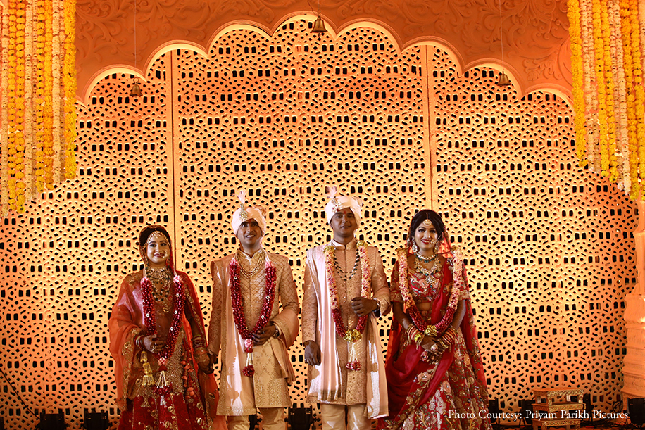 For brothers Ashok and Chandan, the bounty of their joy doubled with a spectacular double wedding that unfolded at the exotic Aamby Valley City. Having found their soulmates together, they envisioned the celebration of a lifetime, and their dream wedding was brought to life with incomparable grandeur by WeddingSutra Favorite – 7X Weddings. As the two exuberant couples reveled in the festivities, their moments were eternalized by WeddingSutra Favorite – Priyam Parikh Pictures.