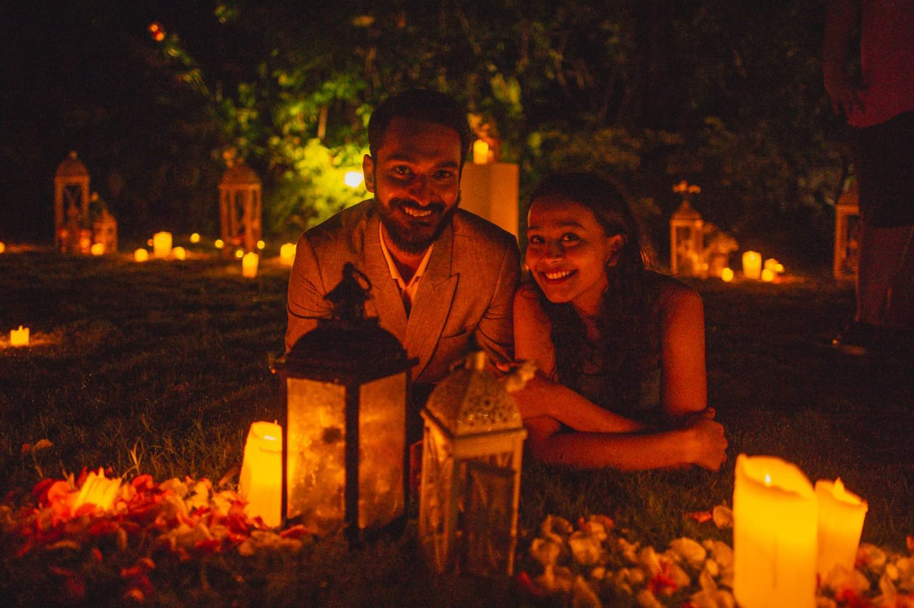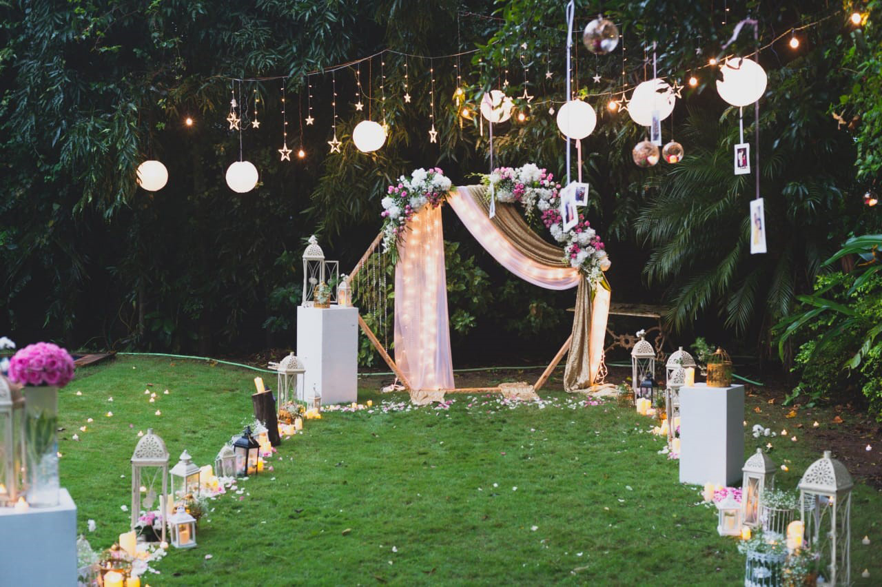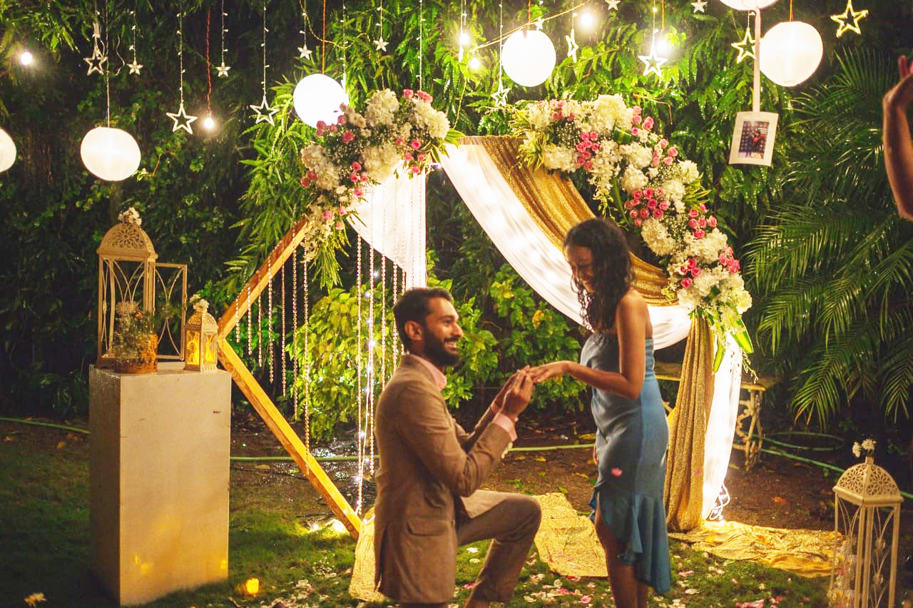 With a magical setup consisting of white lanterns, flowers, candles, twinkling fairy lights and pictures of all their happy moments through their 10-year journey spread out on a green lawn, Aman went down on one knee in front of his childhood sweetheart who looked stunning in a blue dress.