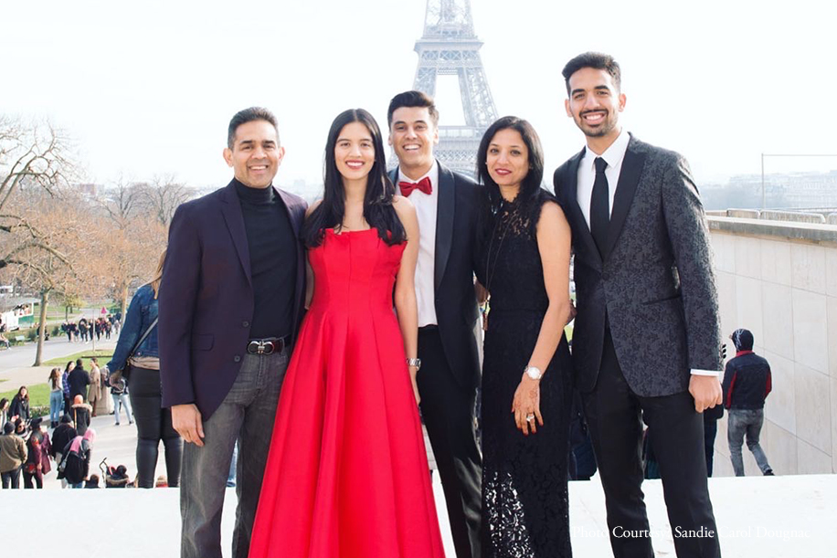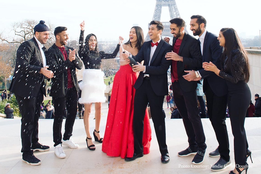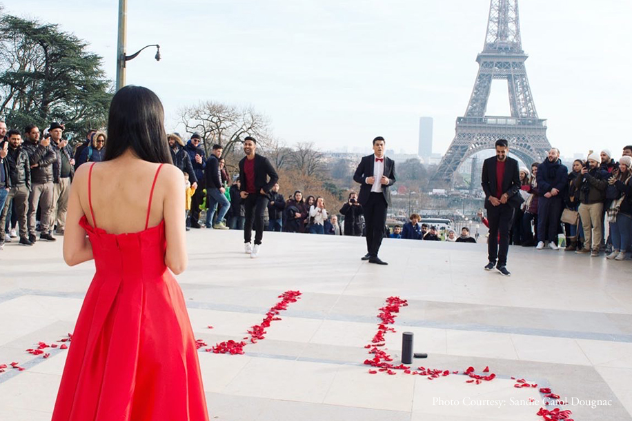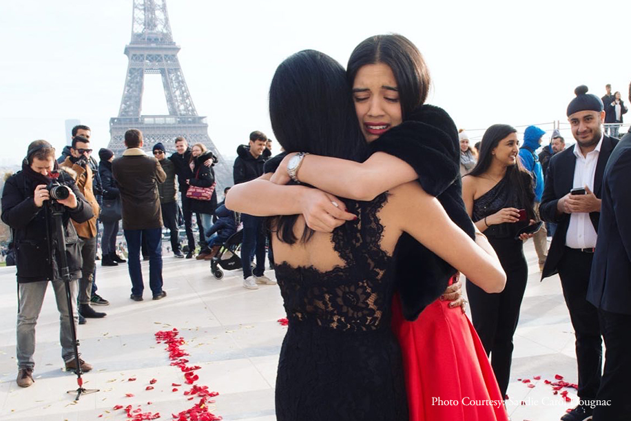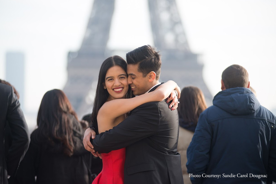 Shivani goes on to share, “Shyam and I were in a long-distance relationship for over a year. I was working in Mumbai and he was in New York City. I didn’t have even the slightest hint that on my way to NYC I’d experience one of the best days of my life. My parents told me our flight from Delhi got rerouted from Frankfurt to Paris. I was clueless and didn’t think much of it. I decided to use our ‘layover’ to go out shopping. As soon as we walked out of the Paris airport, a man, who turned out to be our fantastic videographer, was holding a placard with my name written on it. As soon as I saw it and stopped, he handed me the first note from Shyam. A limo picked me up and took me to a hotel room which was decorated with rose petals. There was a red gown, heels and another note laid out on the bed. I got dressed, went back in the limo and received the final letter, which asked me to watch a 20-minute video. I cannot even begin to explain the amount of work and effort that went into this video. Over ninety of my closest friends and family members sent in choreographed dances and video messages, along with Shyam’s hilarious narrative that weaved it all together. I was blindfolded and brought to a location with a stunning view of the Eiffel Tower. Shyam orchestrated a flash mob and six of our closest friends flew in to surprise me during the dance. Shyam asked my parents for my hand in marriage and got down on one knee. A whole lot of tears, smiles and ‘Oh my gods!’ happened after I said ‘Yes’. I’m still in disbelief. It truly felt like a dream.”