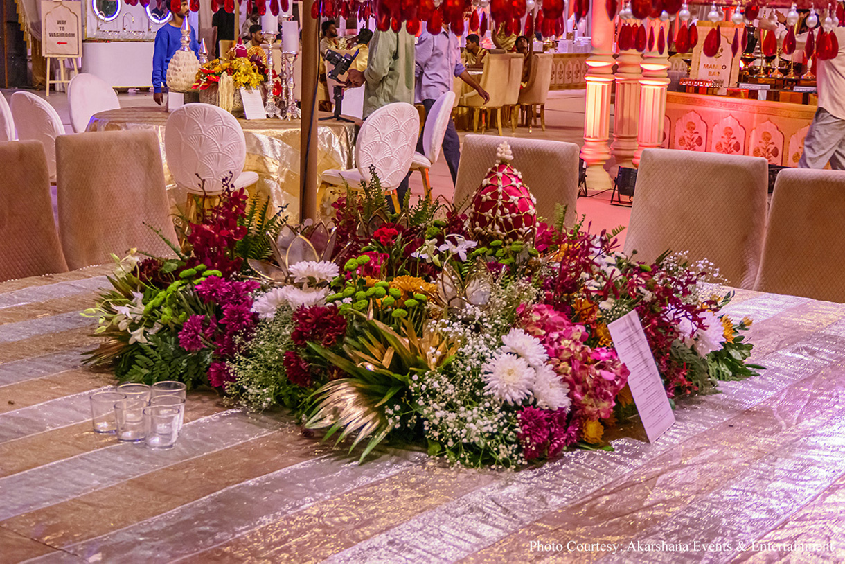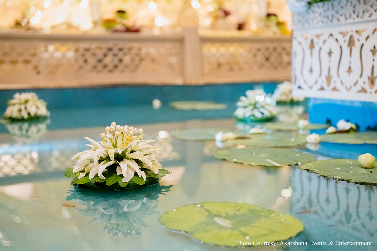 Madiraju Shravan, Founder and CEO of Akarshana Events & Entertainment, shares “Our team flawlessly orchestrated every detail, from the installation of the water pond and mandap to the arrangement of thousands of traditional flowers, ensuring that each element was harmoniously integrated into the overall design. The result was a unique wedding setting that perfectly embodied the bride’s vision while showcasing our capability to deliver complex and high-quality creations under tight deadlines.”