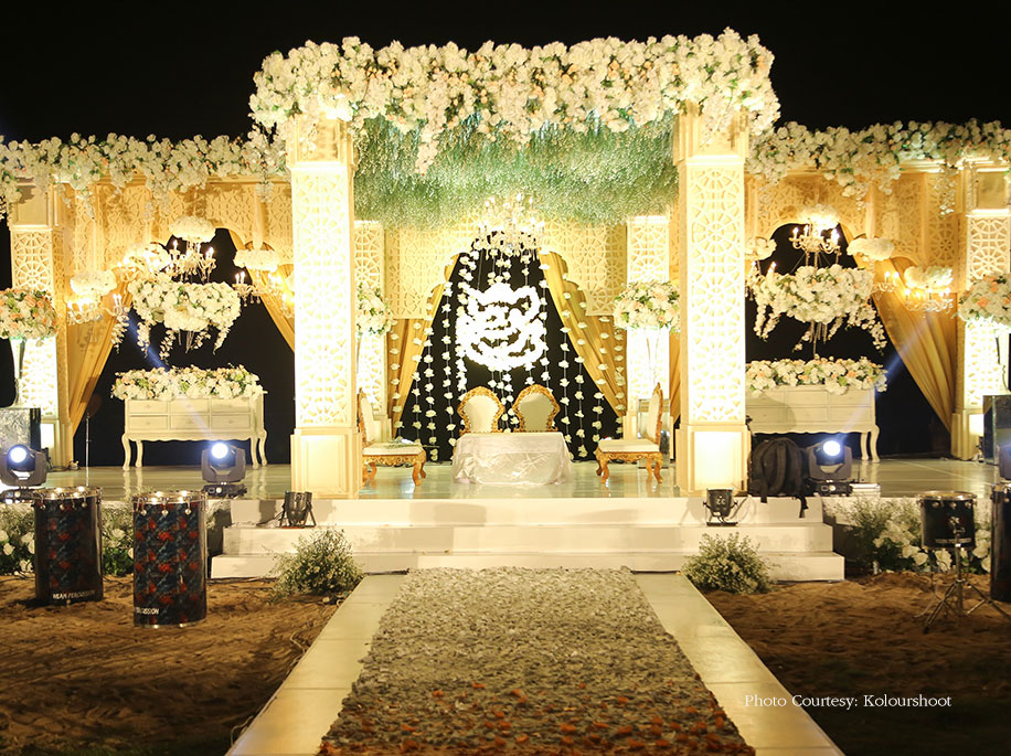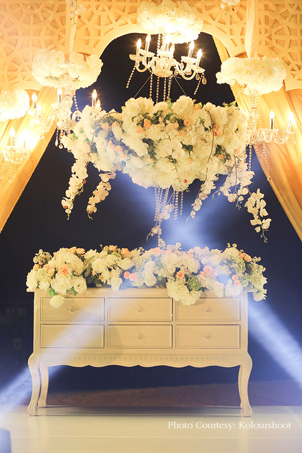 The wedding venue was a vision in white with an exquisitely carved wooden mandap decorated with pampas grass stalks, lush foliage Balinese props and white blooms erected against the blue backdrop of the ocean. Vintage white dressers festooned with blooms and enormous floral chandeliers were highlights of the decor, while a magnificent floral Lord Ganesha installation added an auspicious touch to the event. The aisle leading to the mandap was completely covered in rose petals.