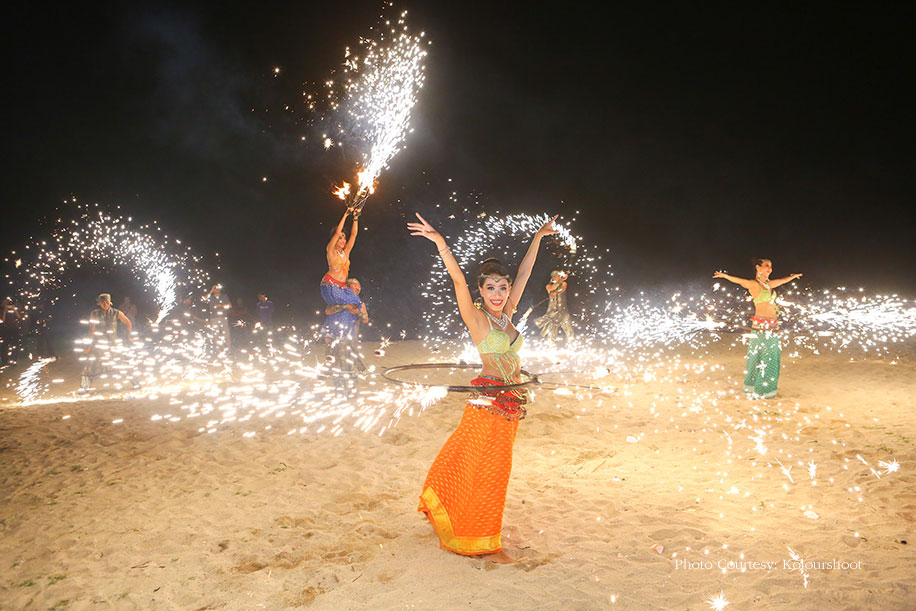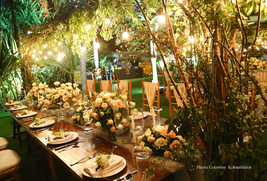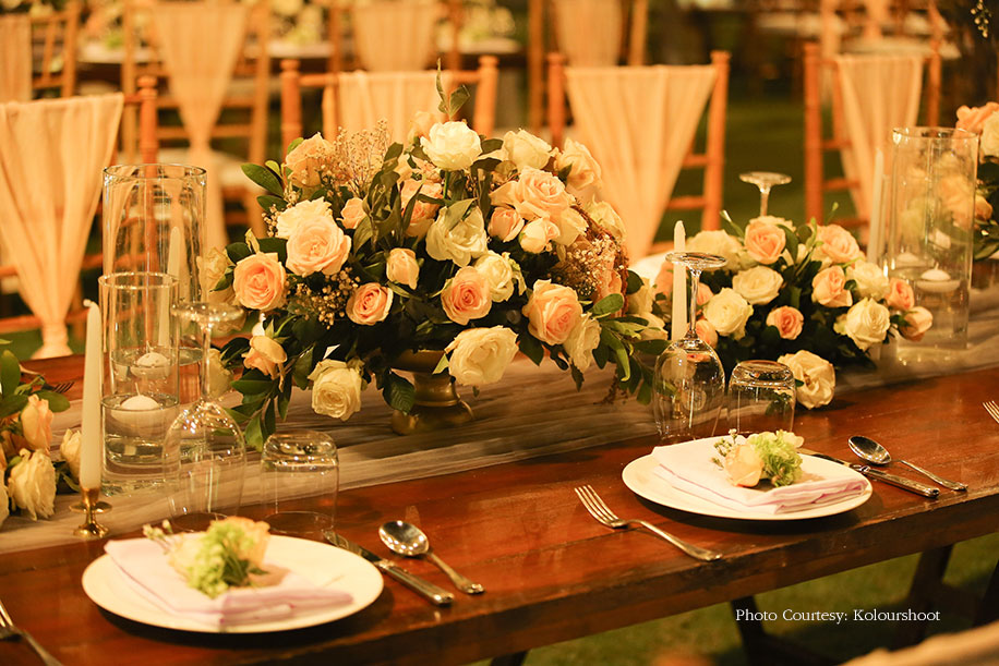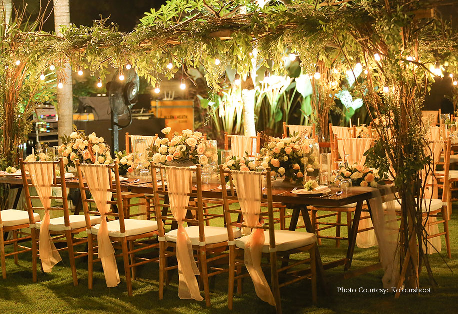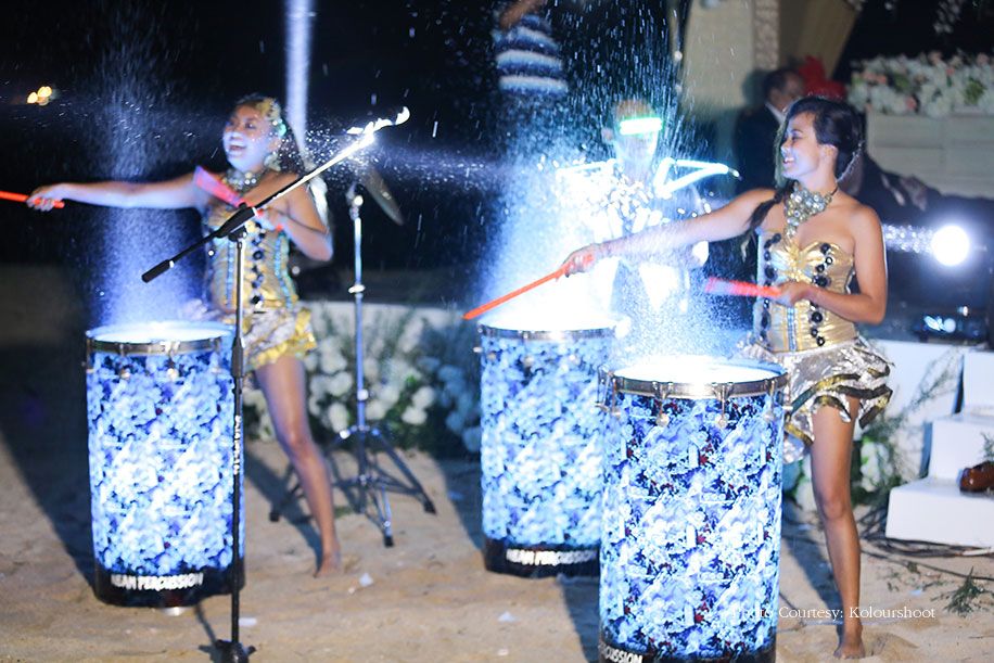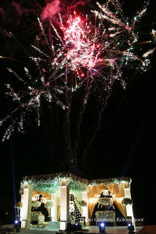 The wedding ceremony was followed by a celebratory dinner with long table seating arrangements. Cascading greens and incandescent bulbs formed the canopy of each table, while elegant arrangements of hand-picked roses, lilies, carnations and twinkling candles comprised the table decor. A spectacular display of local fireworks, Indonesian fire dancers and professional water drummers accompanied Naman’s enchanting entry, and all the guests were further wowed by the sight of Aastha walking in with a troop of Balinese dancers who wore cold pyros!