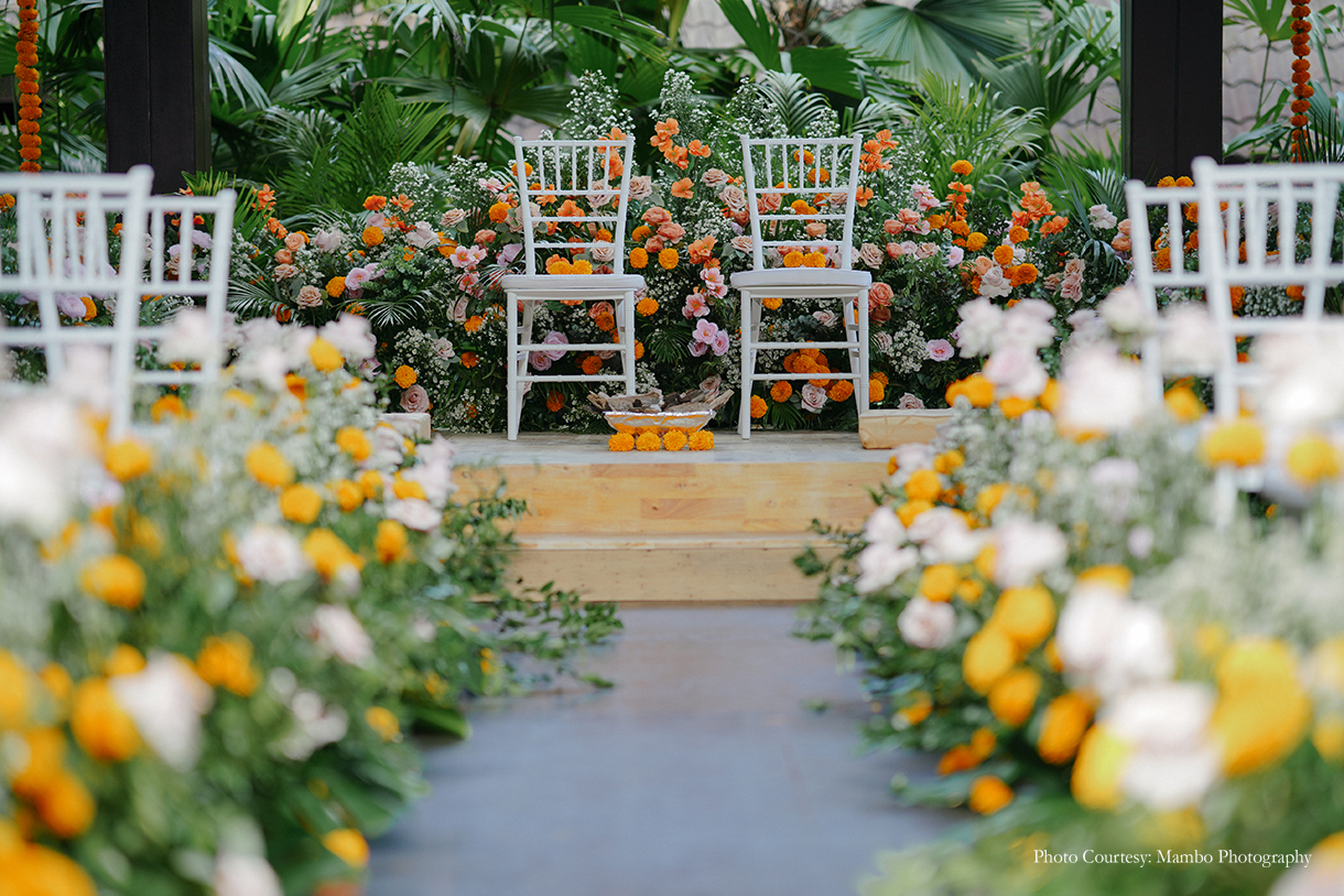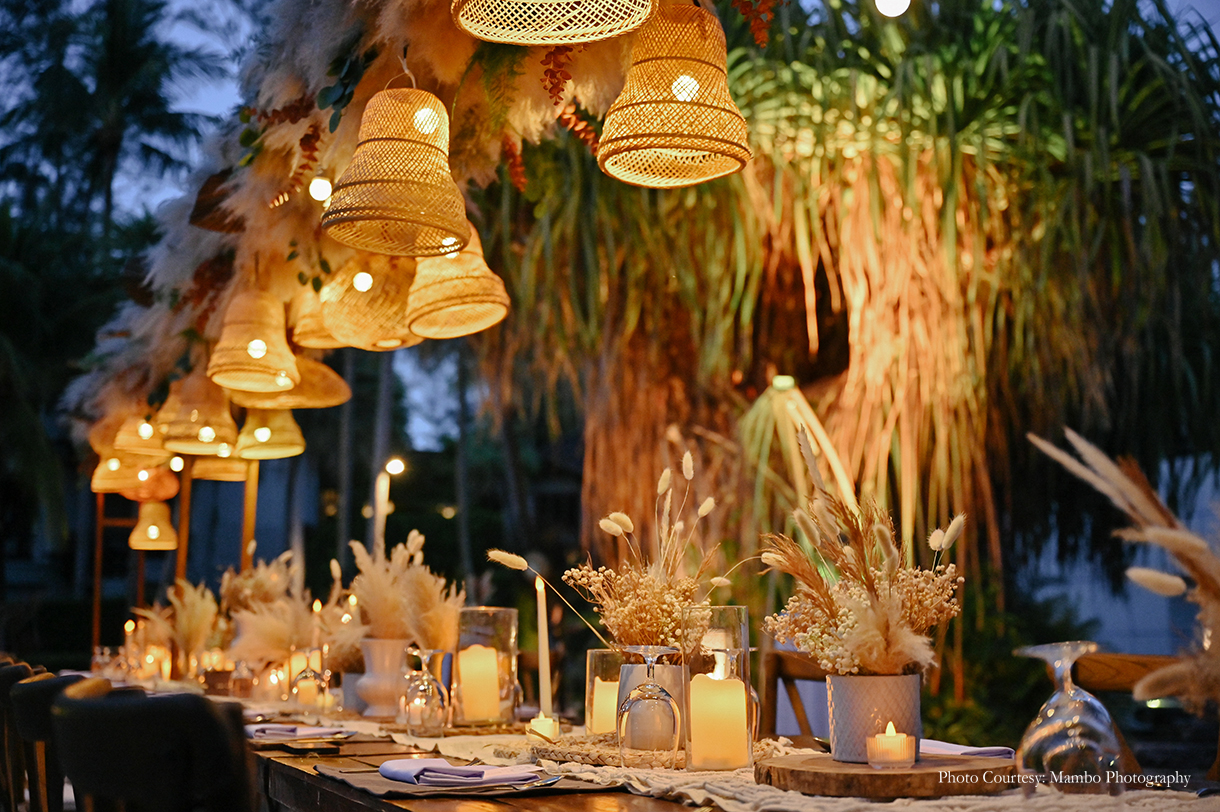Priyanca, a Gujarati and Dominic, of Chinese descent, are based out of Amsterdam and were enthusiastic about celebrating this milestone in a country that would be convenient to fly to for their respective families. Plus, The Slate, Phuket was the very same hotel they’d married in! Kickstarting the festivities was a warm boho welcome dinner party. Adorned with wicker lamps and pampas in a very boho chic ambience – this party delighted the guests while making them feel comfortable. This was then followed by an Indian blessing celebration which flaunted a profusion of marigold blooms that struck a beautiful contrast with the white furnishings.