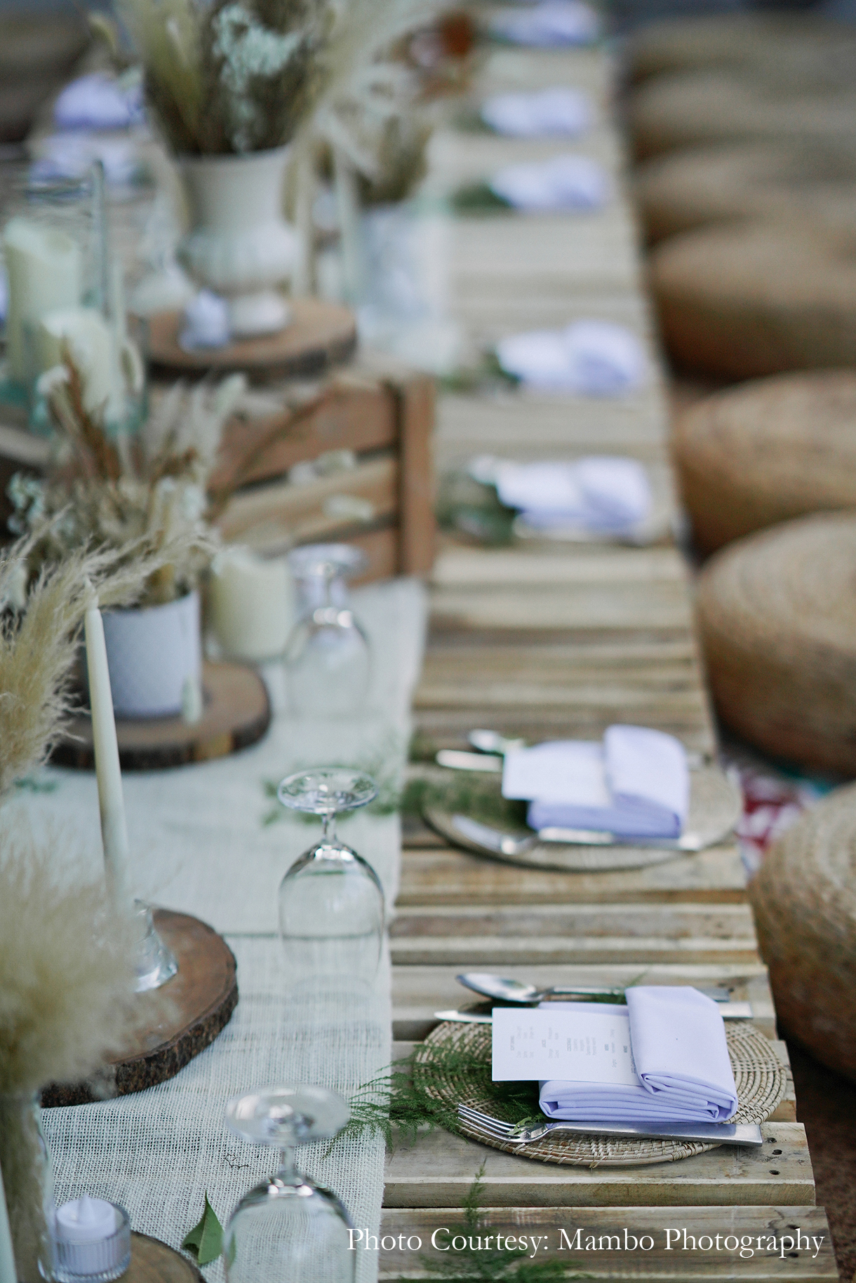 An English-style vintage setup, complete with a violinist and overflowing champagne, was arranged for their Vow Renewals at a classic wooden venue. The atmosphere here was decidedly rustic and elegant with white blooms lining the aisle while ivory hues rattan-backed chairs made the guests comfy. Floral cones were provided to every attendee to shower on the couple while three crystal chandeliers added a touch of glam to the heartwarming ceremony. The celebrations concluded with an elegant reception dinner where fairy lights and candles created a twinkling effect, setting the perfect party mood.